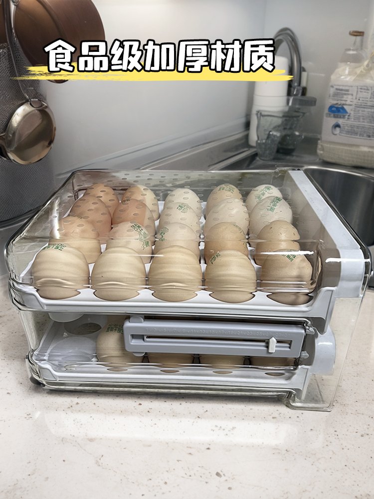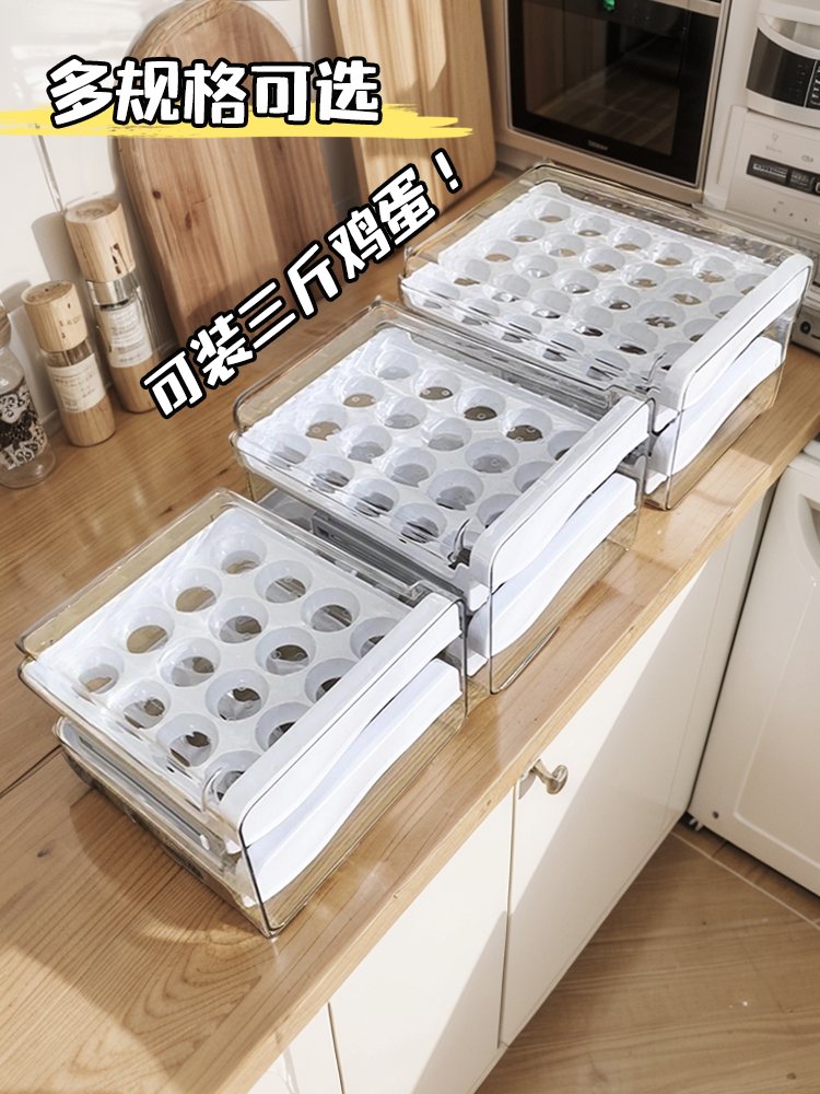 家人们,今天推荐抽屉式设计,鸡蛋拿取顺滑方便省时省力,冰箱再也不乱糟糟了。大中小多规格可选,满足多种家居环境收纳需求,大容量可装3斤鸡蛋;食品级高透加厚材质,质保一年安全放心,加深凹槽鸡蛋不可不碰不破碎,密封保鲜鸡蛋存储更持久,想要的姐妹抓紧冲!