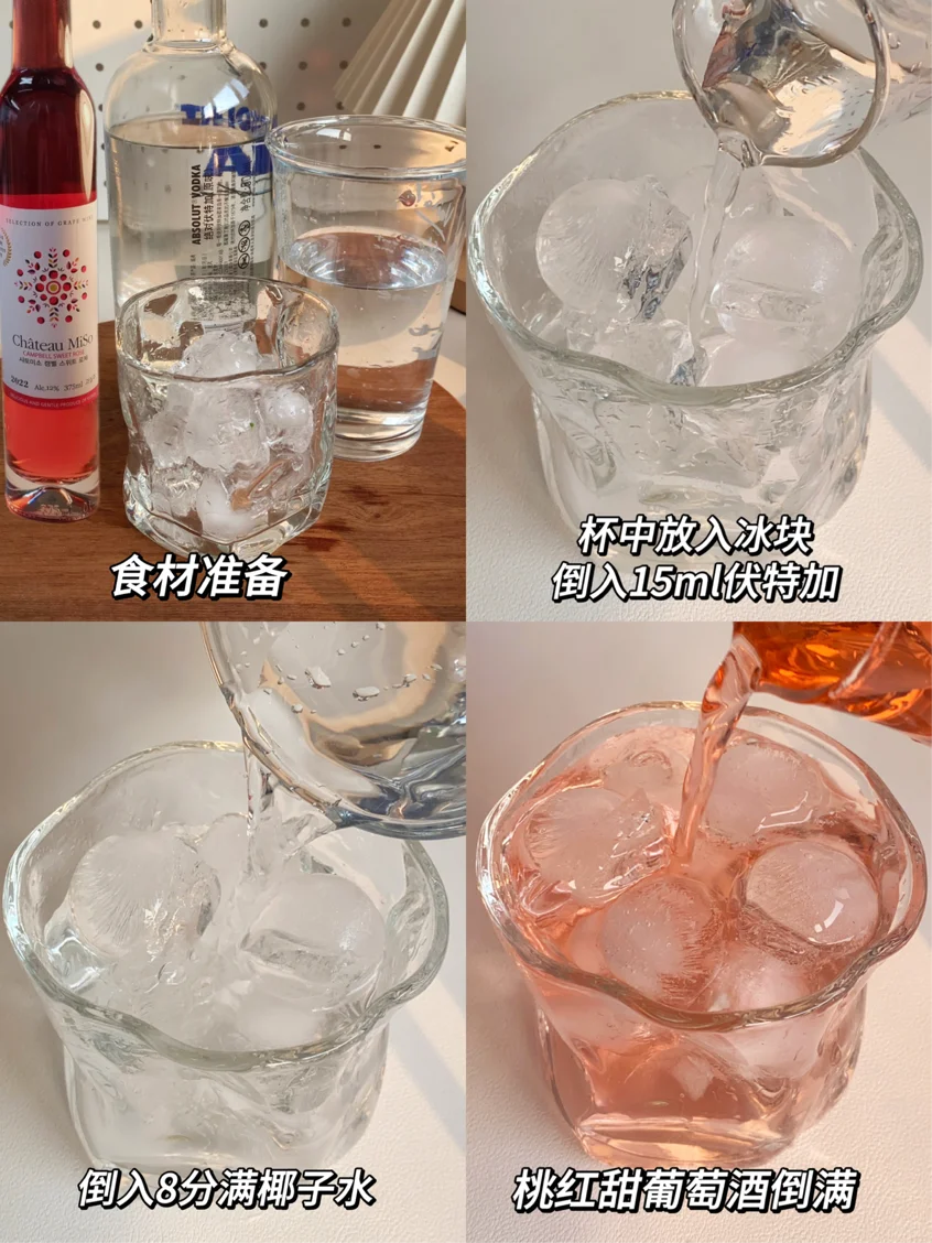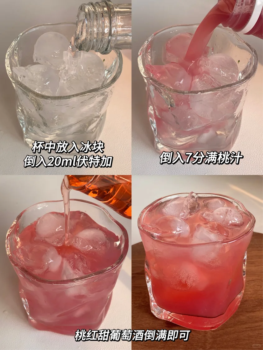 1⃣️伏特加➕桃汁➕甜葡萄酒➕冰块