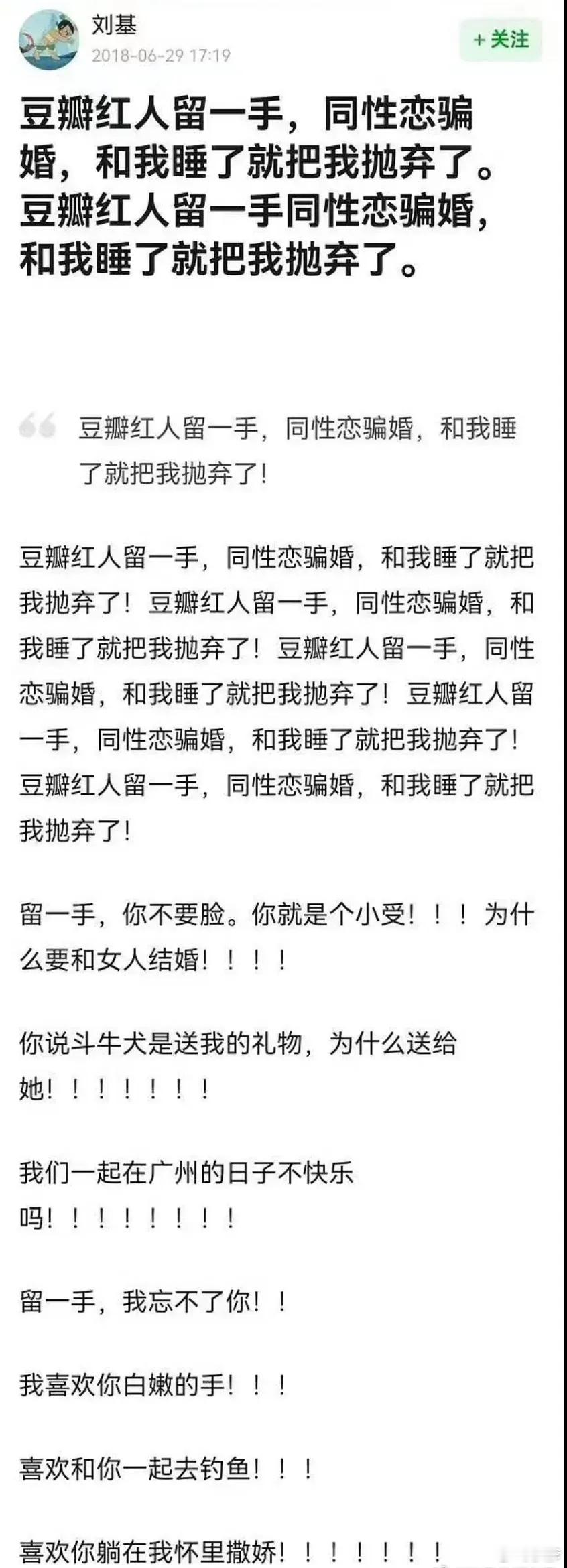 留几手 恐怖 互联网的记忆真可怕。6年前,留几手就被指控是同性恋骗婚。难怪家里天天守着一个漂亮性感的娇妻,3年没有夫妻生活,去医院检查又指标正常。别耽误葛夕了,快点离!