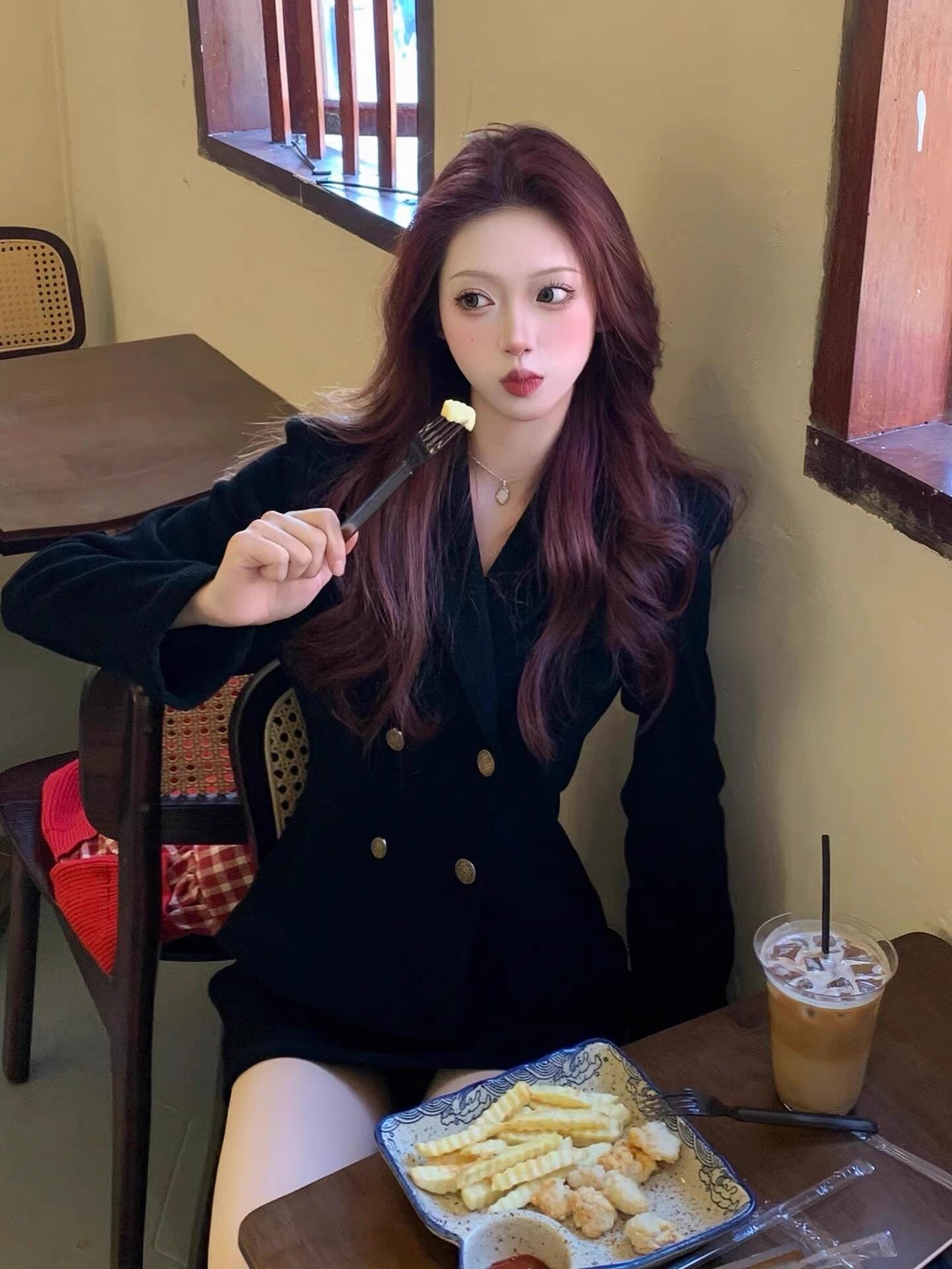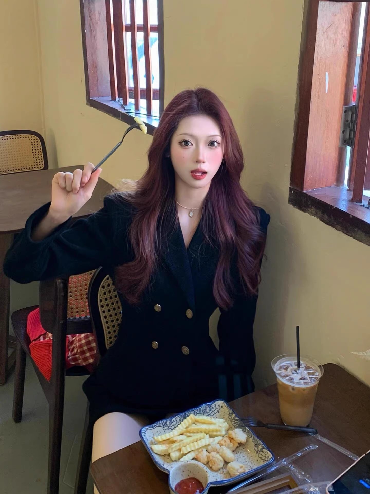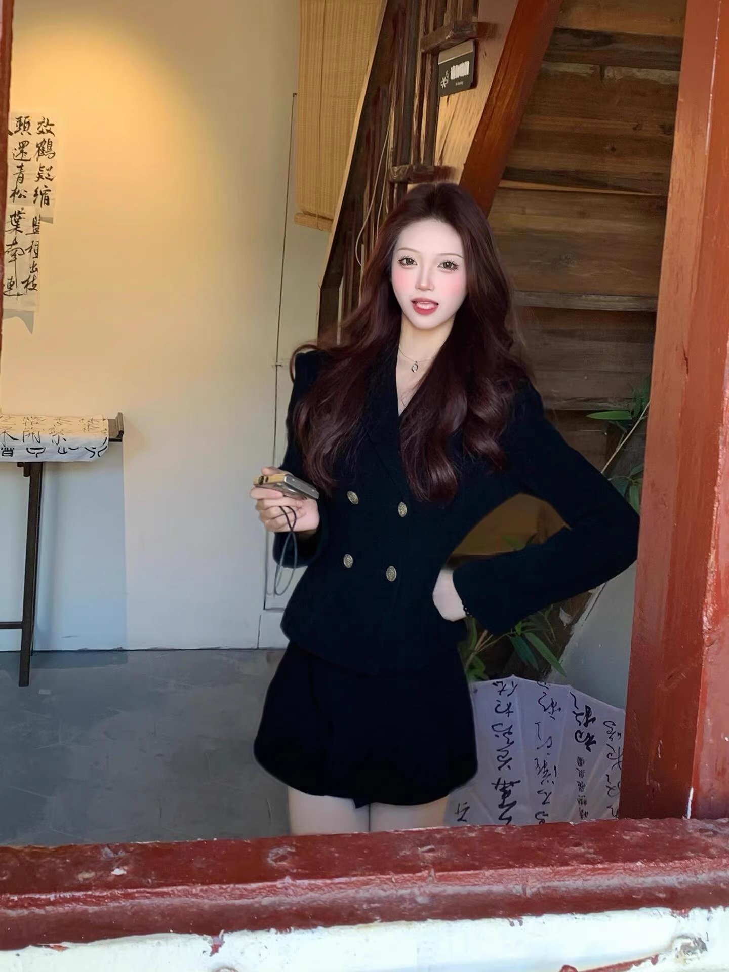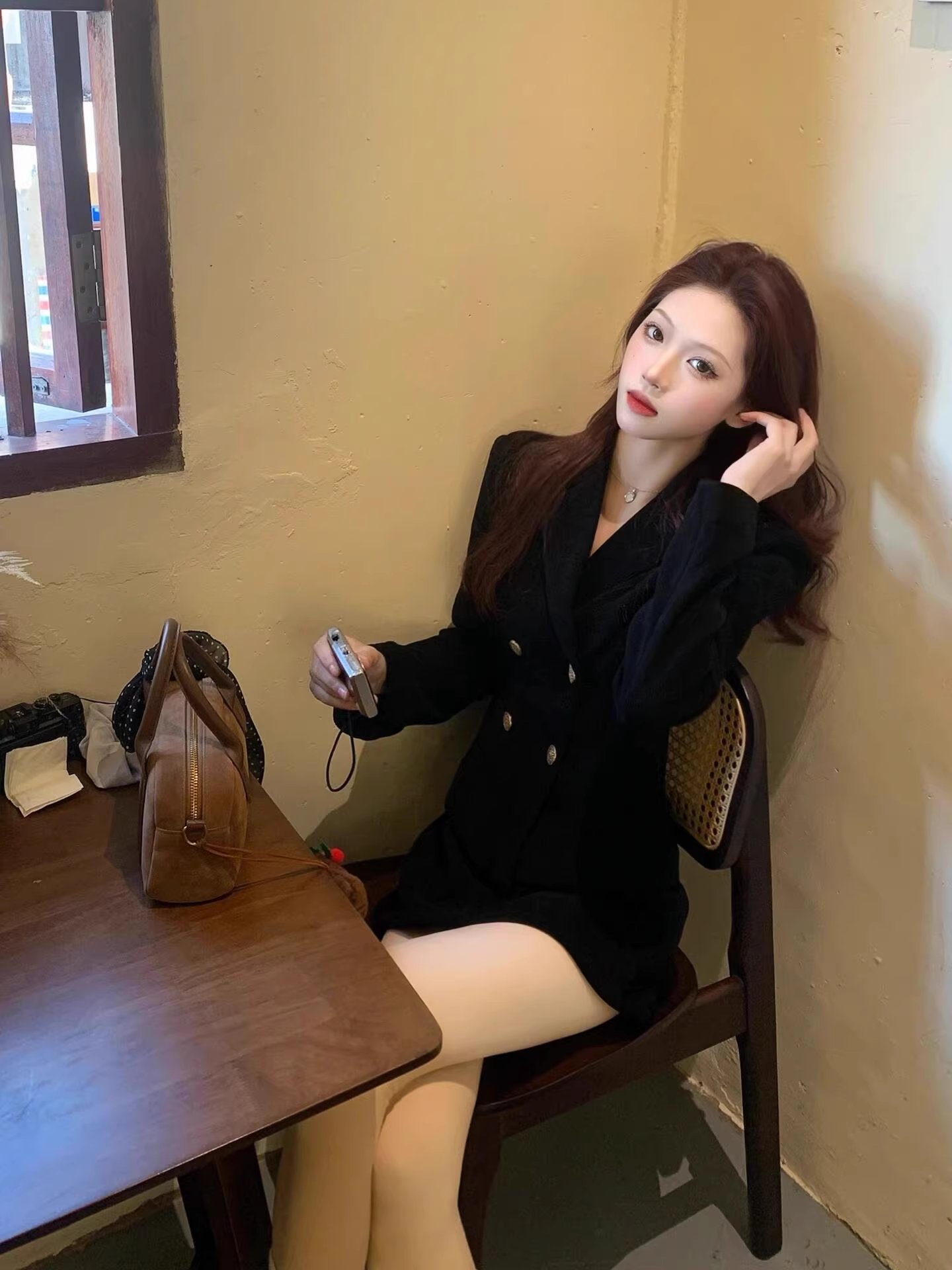 2025秋冬季新款黑色西装战袍连衣裙子法式包臀短裙穿搭一整套装女