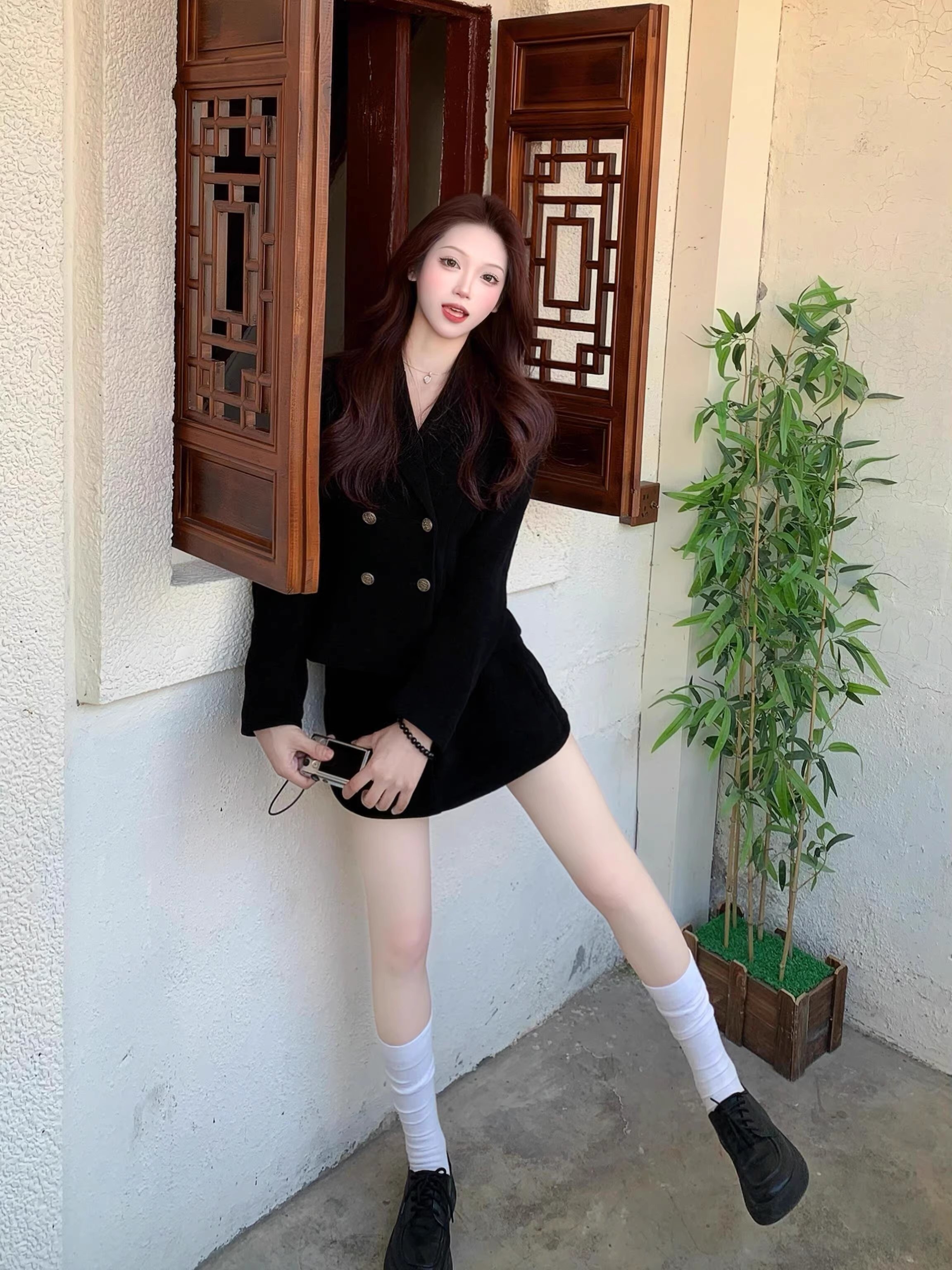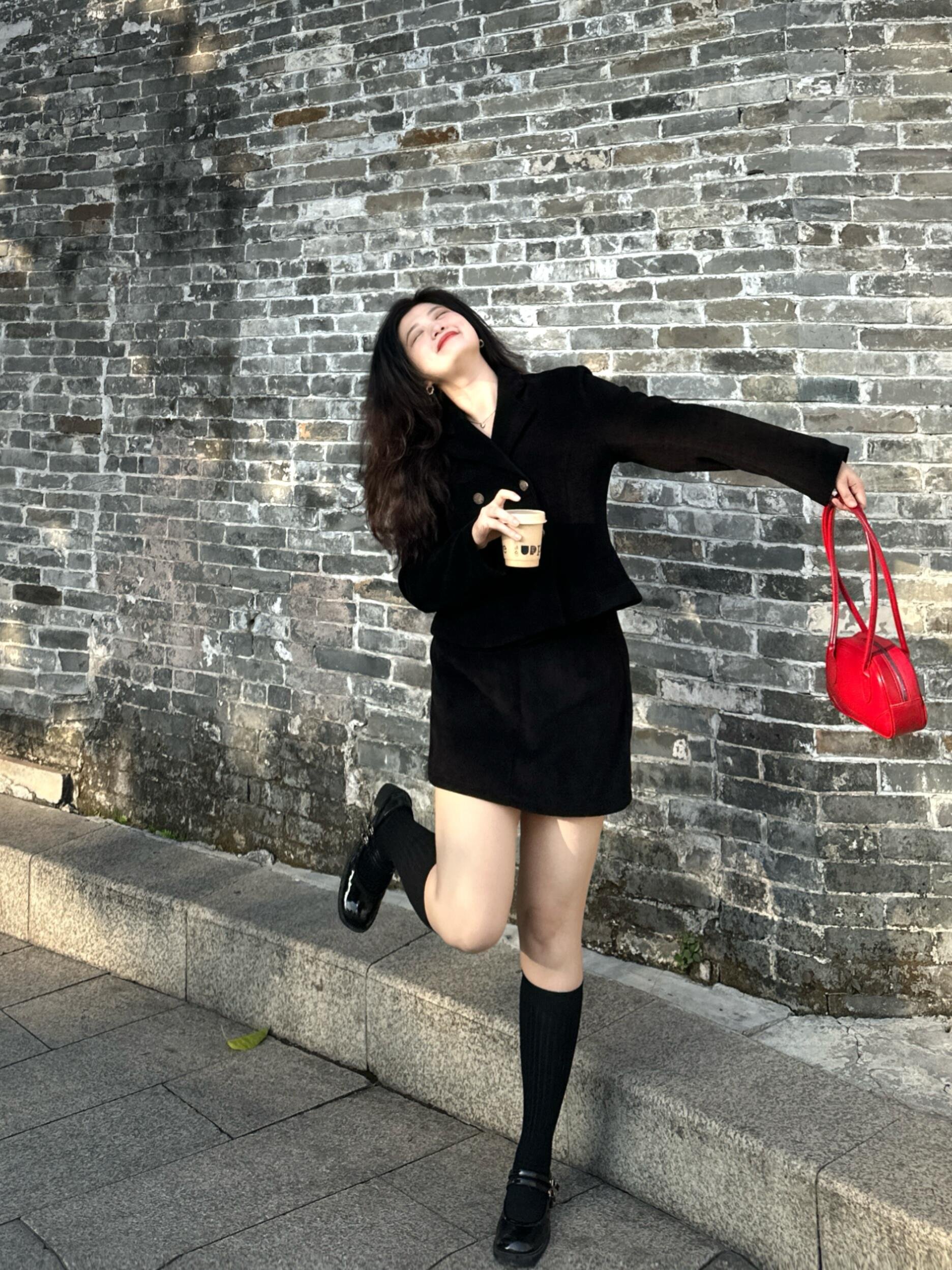 过新年黑色西装战袍连衣裙气质包臀短裙套装