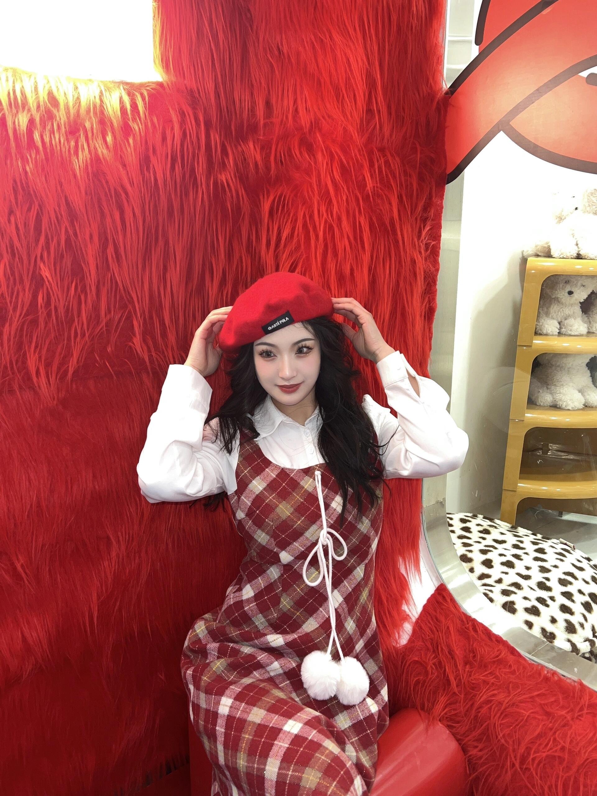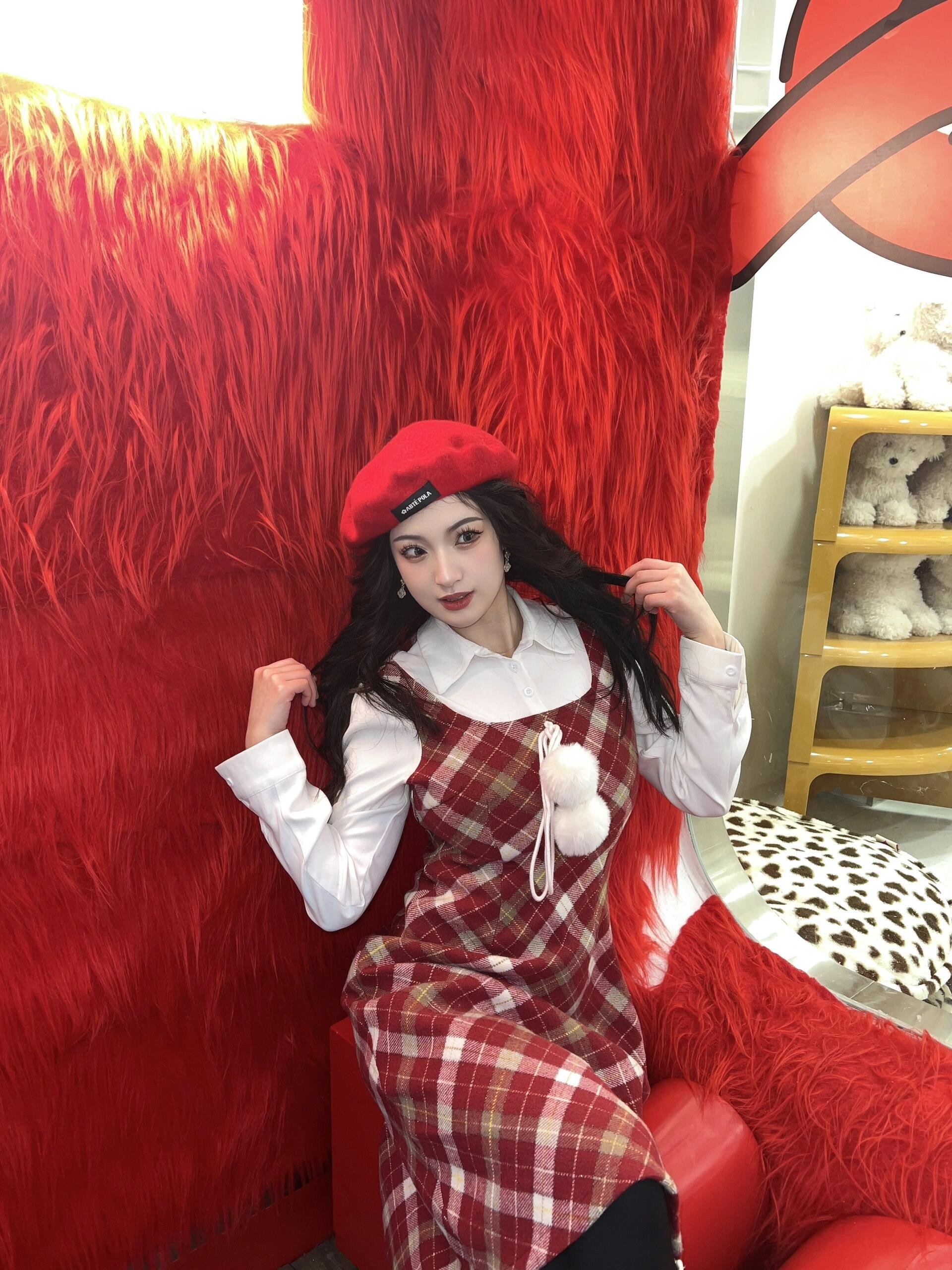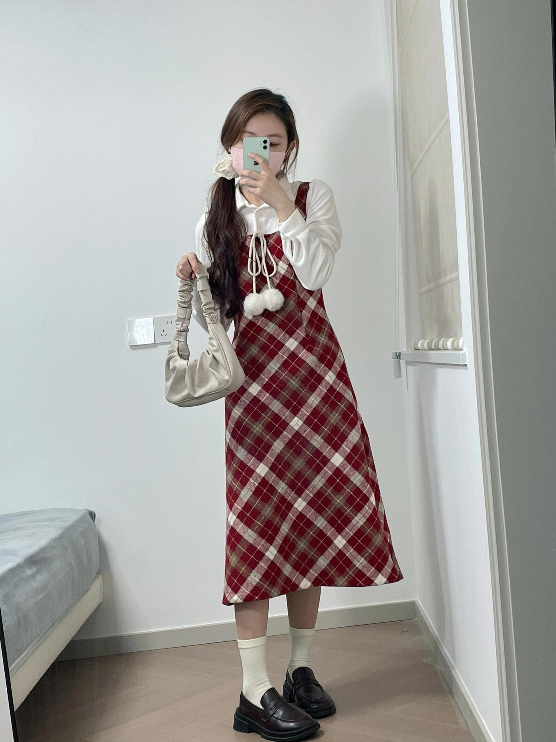 2025秋冬新款polo假两件格子红色新年战袍连衣裙子女法式打底长裙