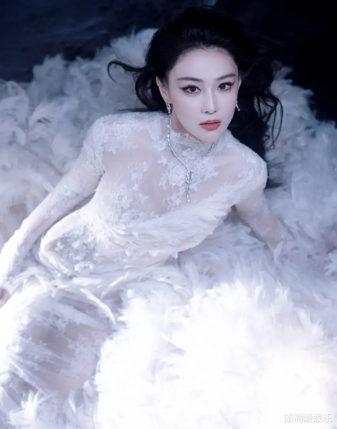 她身穿高定礼服,内搭半透视蕾丝长裙,采用非遗苏绣工艺精制而成,细腻纹路随身形流转,精准勾勒出曼妙曲线,尽显东方女性的柔美与性感。外披长达三米的纯白羽毛披肩,在海风中轻盈舞动,营造出“又纯又欲”的极致反差美学。整套造型将古典技艺与现代设计完美融合,成为当晚最令人难忘的高光时刻。