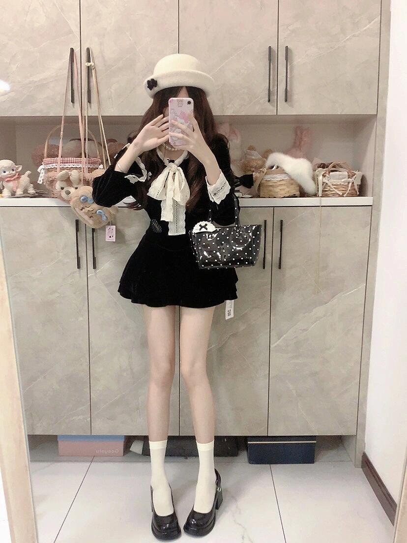 法式蝴蝶结黑色小香风丝绒连衣裙女2025新款圣诞新年短裙套装战袍