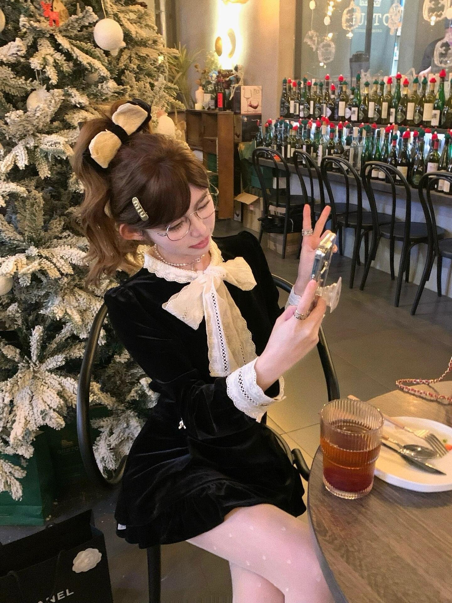 跨年穿搭法式蝴蝶结黑色小香风丝绒连衣裙