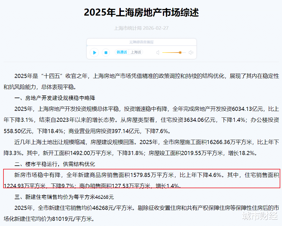 上海统计局披露的数据显示,2025全年新建商品房销售面积1579.85万平方米,同比下降4.6%。其中住宅销售面积1224.93万平方米,下降9.7%。