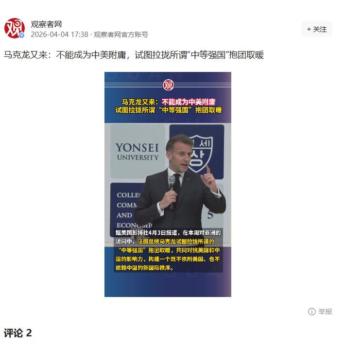 观察者网:《马克龙又来:不能称为中美附庸,试图拉拢所谓中等强国抱团取暖》
