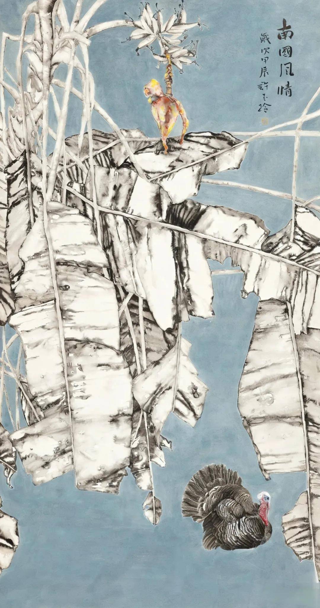 人生转折发生在2018年。那一年,她正式拜入中国著名花鸟画家秦少甫先生门下,系统研习中国工笔与写意花鸟技法。秦先生常教诲,画花鸟不可徒写其形,更要传其神、得其气。许玉玲心领神会,潜心践行。求学期间,她如海绵吸水般汲取养分,工笔之精细一丝不苟,写意之洒脱反复体悟,逐渐形成了工写结合的个人面貌:既有工笔的细腻精致,又具写意的灵动洒脱。