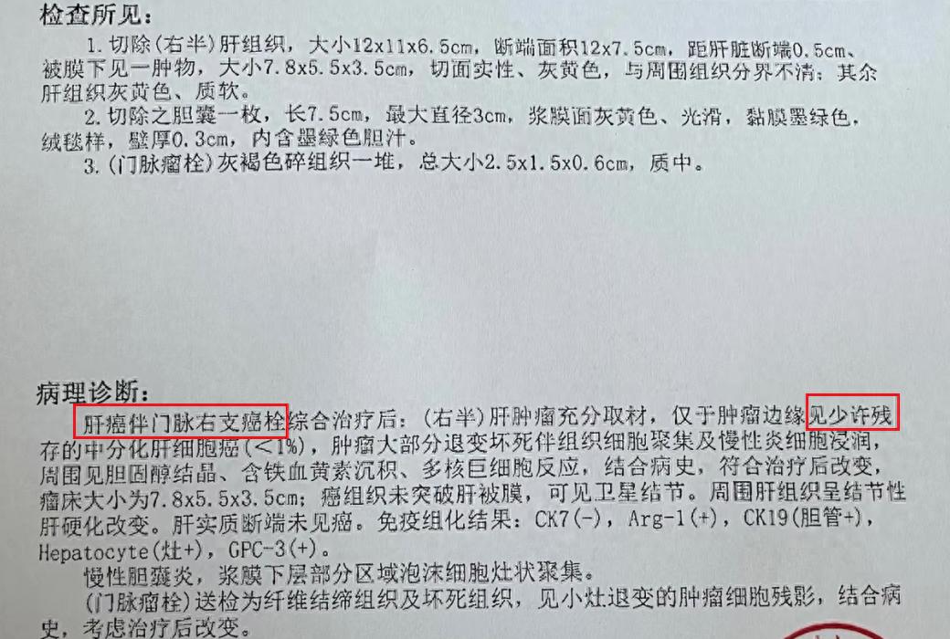 残留的癌细胞仍不可忽视,尤其是存在门脉癌栓,这意味着癌细胞已进入血管,增加了转移的风险,属于病情中不利的一面。