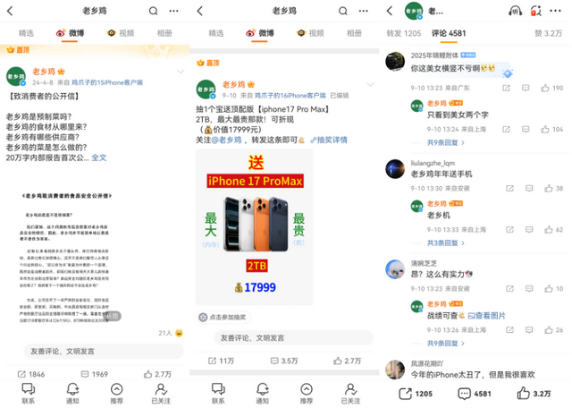 以同行老乡鸡为例,其在微博置顶的两条内容,一条是24年4月的公开信,回应了消费者对“预制菜”的相关质疑,并标明了哪些是餐厅现做、半预制、复热预制的菜品明细以及供应商信息,态度和诚意都无可挑剔;另一条则是25年9月10日最新发起的品牌有奖互动福利,网友想要什么,老乡鸡就紧跟什么;而在日常,高频输出的趣味内容和“网感”表达,以及在评论区的话题互撩,都让老乡鸡的品牌形象变得立体而鲜活。它不是一个被仰视的品牌,而是和消费者玩在一起的“饭友”(有钱还喜欢“撒币”的那种,谁会不喜欢?)。