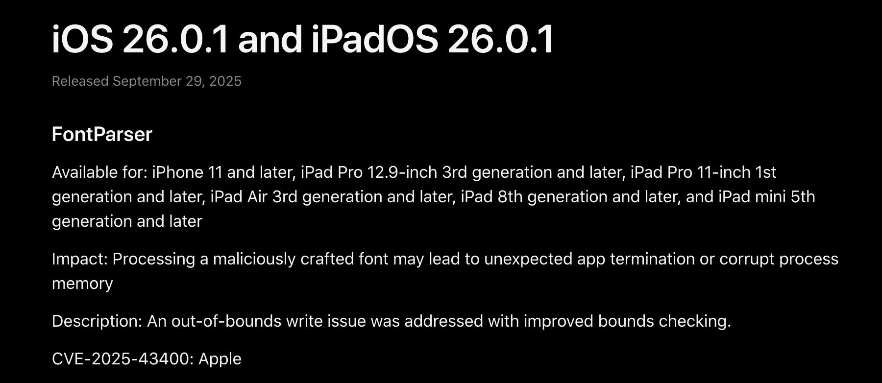 iOS 26.0.1 包含一项安全漏洞的修复,处理恶意构造的字体文件可能导致应用意外终止,或破坏进程内存。