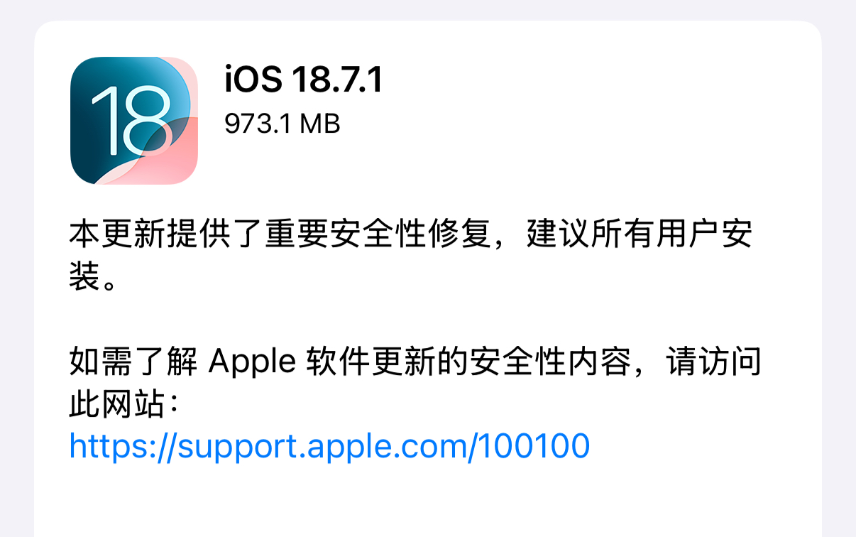 iOS 18 用户对于仍在使用 iOS 18 系统的用户,苹果也同步推送了 iOS 18.7.1 小版本更新。这部分用户可以选择停留在 iOS 18 或考虑 OTA 升级到最新的 18.7.1,继续稳定地使用旧系统。
