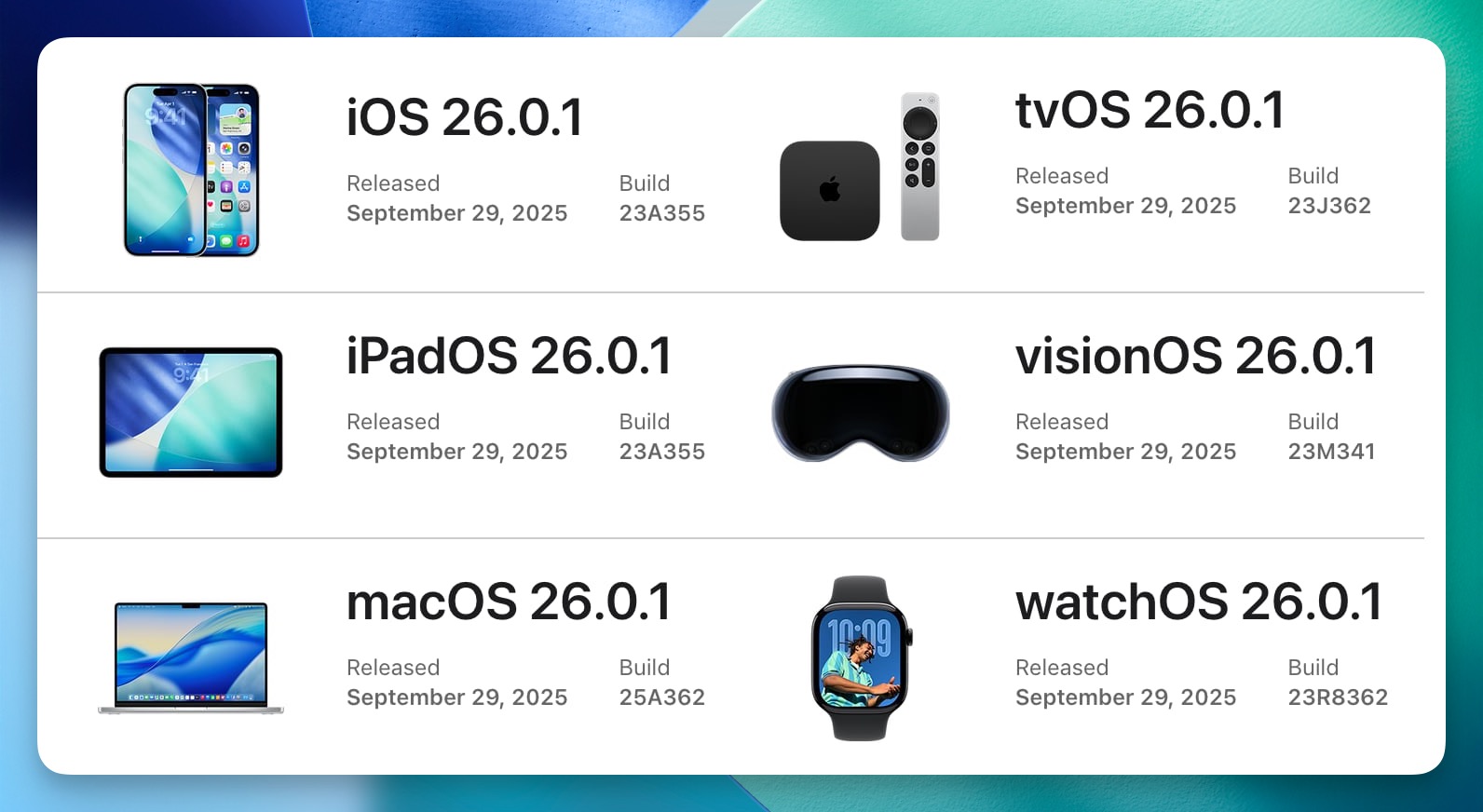 苹果于今日(9 月 30 日)凌晨正式推送了最新系统更新,包括 iOS 26.0.1、iPadOS 26.0.1、macOS、watchOS 和 tvOS 等多款设备的版本更新。
