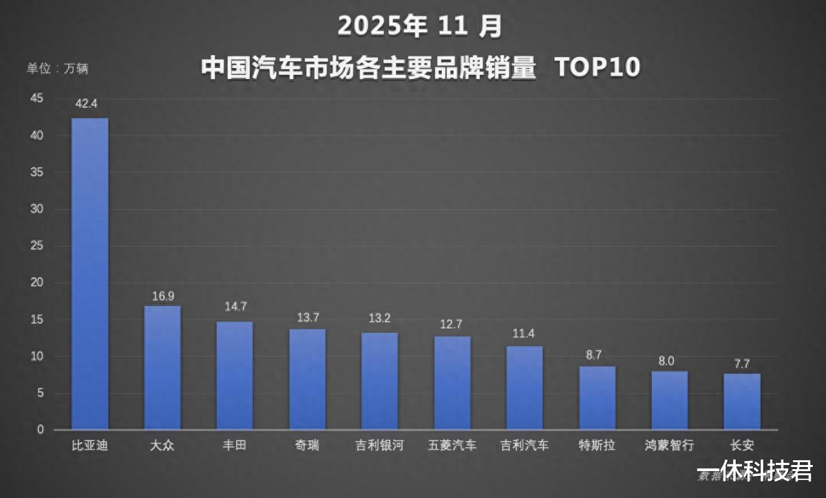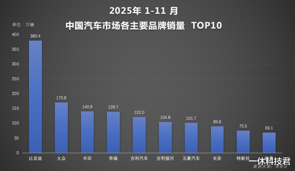 这次比亚迪表现亮眼持续领跑,11月直接卖出48万辆创下年内新高,前11个月累计销量达418.2万辆,同比涨11.3%,全年目标完成率超九成,超额达标稳了。