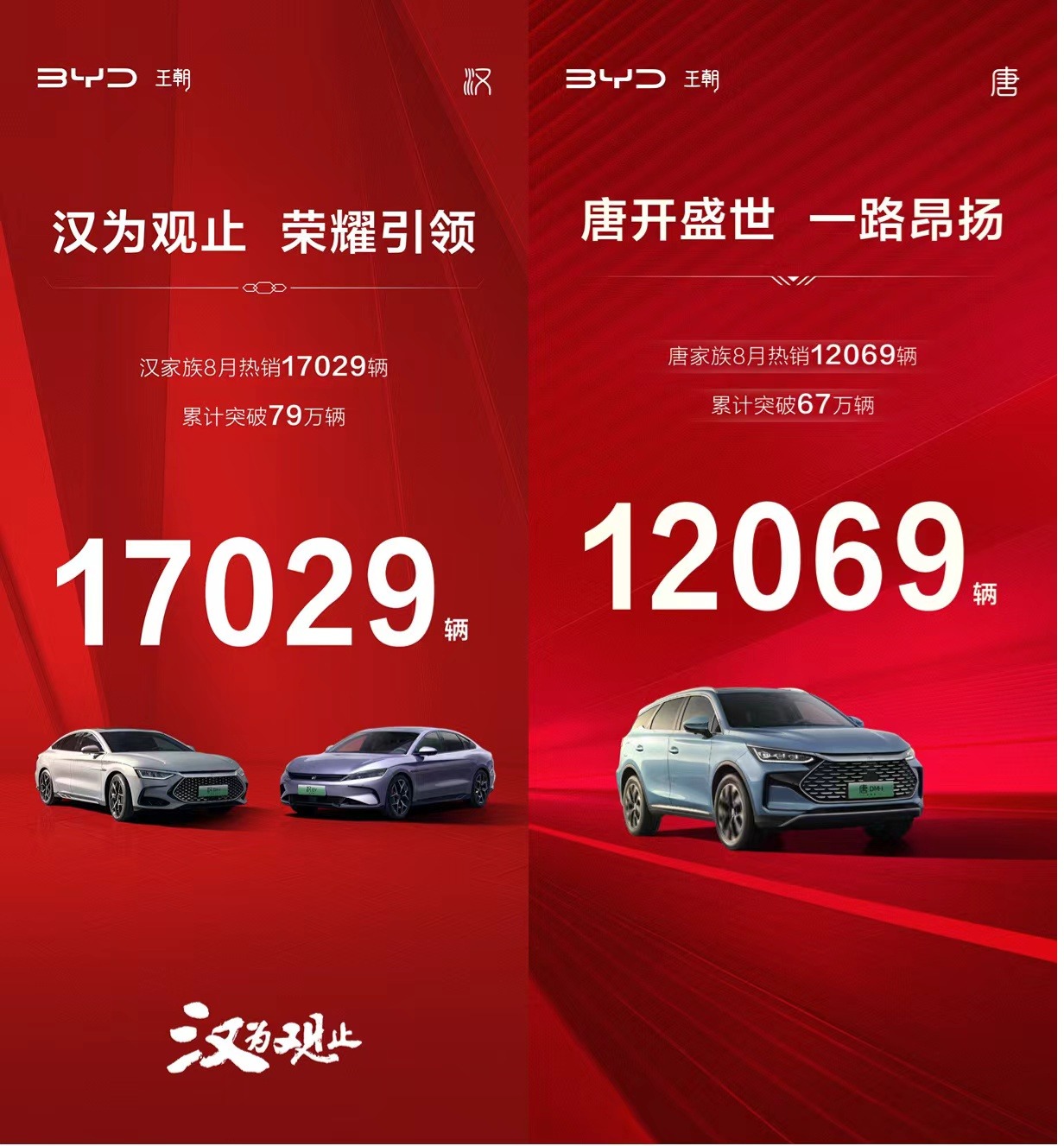比亚迪汉唐家族以核心技术为依撑,极致满足主流消费人群的不同需求,更以独树一帜的产品价值带来远超期待的用车体验。下半年车市“油电之战”仍在延续,站在新起点上。王朝旗舰汉唐家族8月热销29098辆,汉唐家族销量分别为17029辆、12069辆,以实实在在的销量成绩验证“六边形冠军”实力。历史上,汉唐均是开疆拓土的强大王朝。如今,在中国车市的高速转型期,“六边形冠军”汉唐依旧剑锋所指,所向披靡。