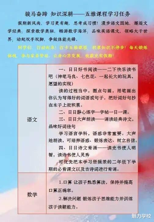 本版块以“五雅课程”为脉络,串联学科积淀、阅读感悟与实践探究,在温故知新中涵养自主学习能力,让知识与生活相融、与心灵相通。同时,学校鼓励同学们每天锻炼体魄,参与家务劳动,让身心齐发展,收获充实假期!