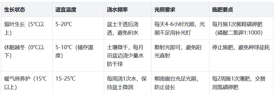 三、修剪后养得对,种球壮来年花爆盆修剪只是基础,冬季养护的核心是“控温、控水、保养分”,不同生长状态的朱顶红,养护方法略有差异,可参考以下表格: