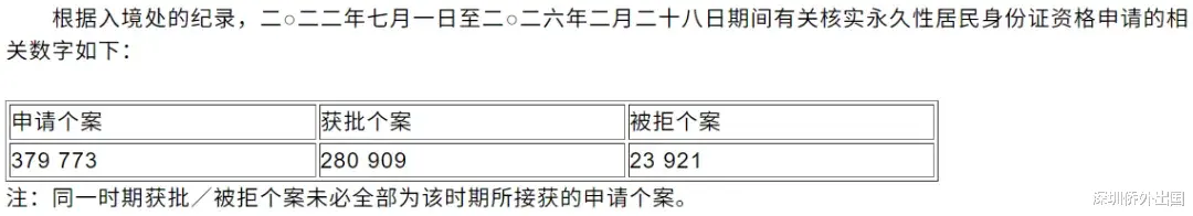 根据入境处统计,2022年7月1日至2026年2月28日期间,香港入境处共接获379773宗核实永久性居民身份证资格的申请。其中280909宗申请获得批准,23921宗申请被拒绝。
