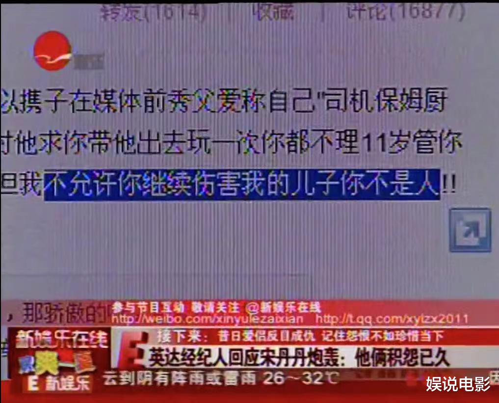 宋丹丹发微博控诉英达,儿子巴图七岁的时候要求爸爸带他出去玩一次都不理,11岁管他要电话也不给,宋丹丹发狠话,不允许英达继续伤害巴图,称对方不是人。