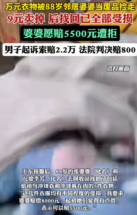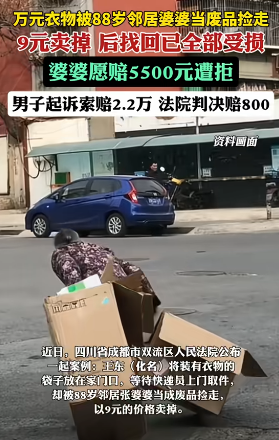 成都双流的王东最近又气又委屈——他花1万多元买的始祖鸟冲锋衣、冲锋裤,因放在家门口等快递员取件,竟被88岁邻居张婆婆当成废品捡走,9块钱卖给了回收站。王东报警后,张婆婆的儿媳李芳虽找回衣物,但只愿赔5500元,远低于王东1万多元的购买价。最终王东起诉,法院综合衣物折旧、使用情况等,判张婆婆赔800元。目前赔偿已支付,但这场“万元衣变9元废品”的风波,让网友吵翻了天。