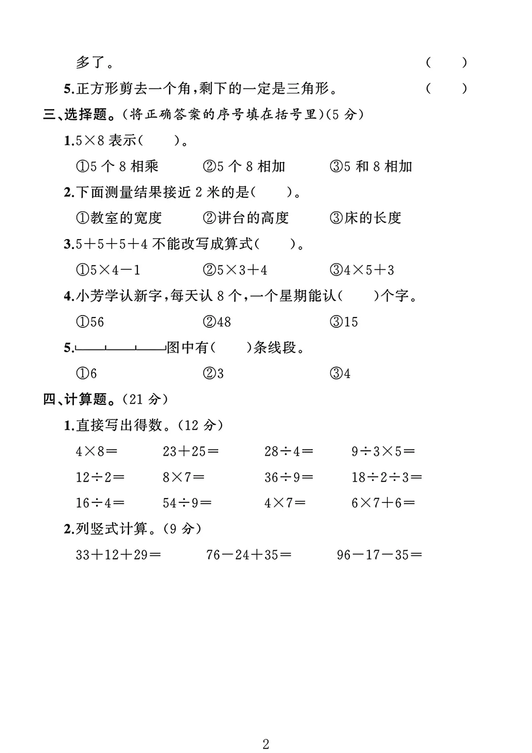 苏教大版二年级数学上册期末试卷 2