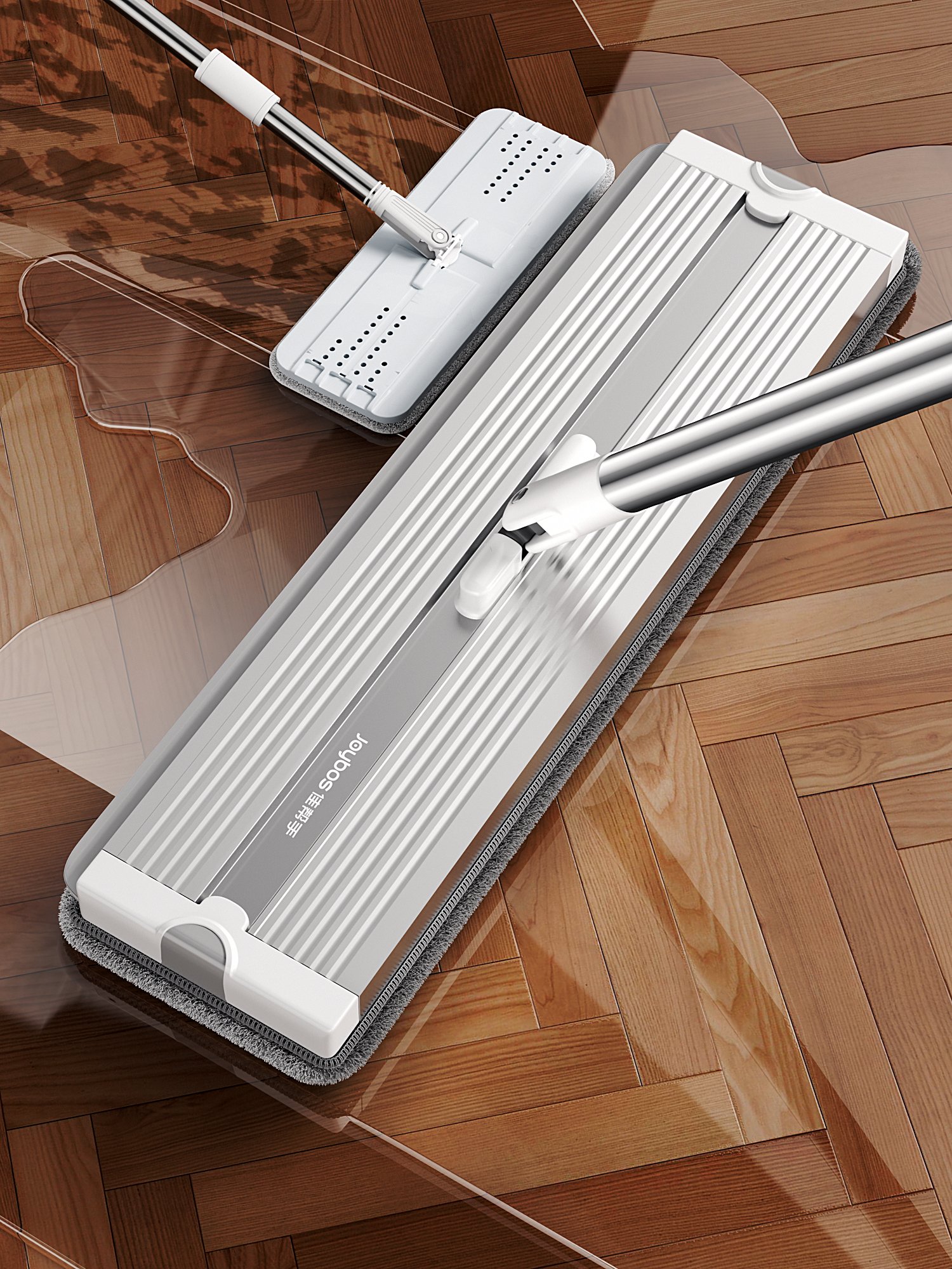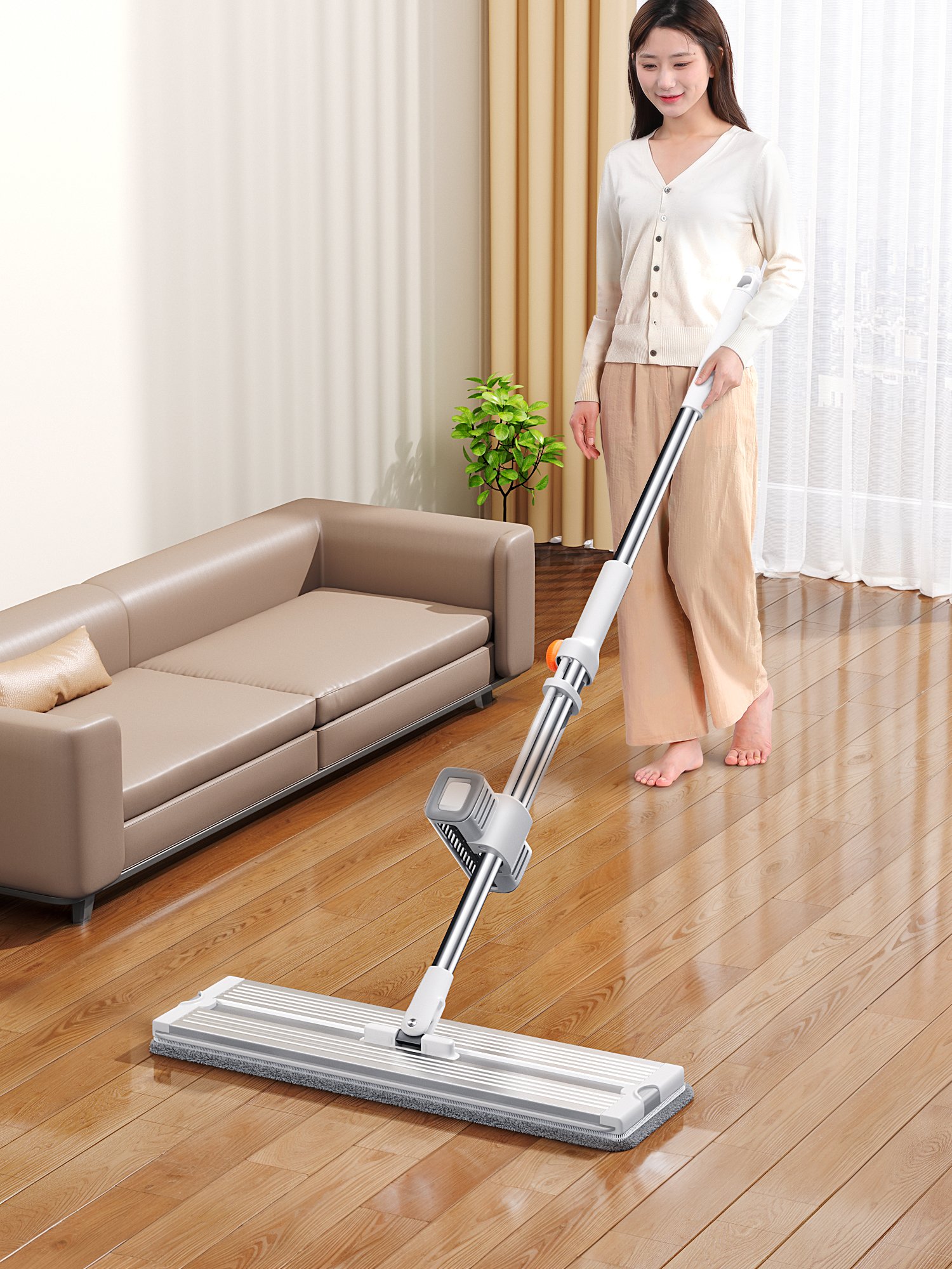 为了帮助您更轻松地完成家庭清洁任务,我们特别推荐一款创新设计的免手洗铝板拖把,让您的清洁工作变得简单、高效且愉悦。拖把主体采用高强度铝合金材质打造而成,重量轻便但结构坚固,不易变形损坏。特制的平板式拖头紧密贴合各种地面类型(如木地板、瓷砖、大理石等)。轻松清洁,享受无忧生活