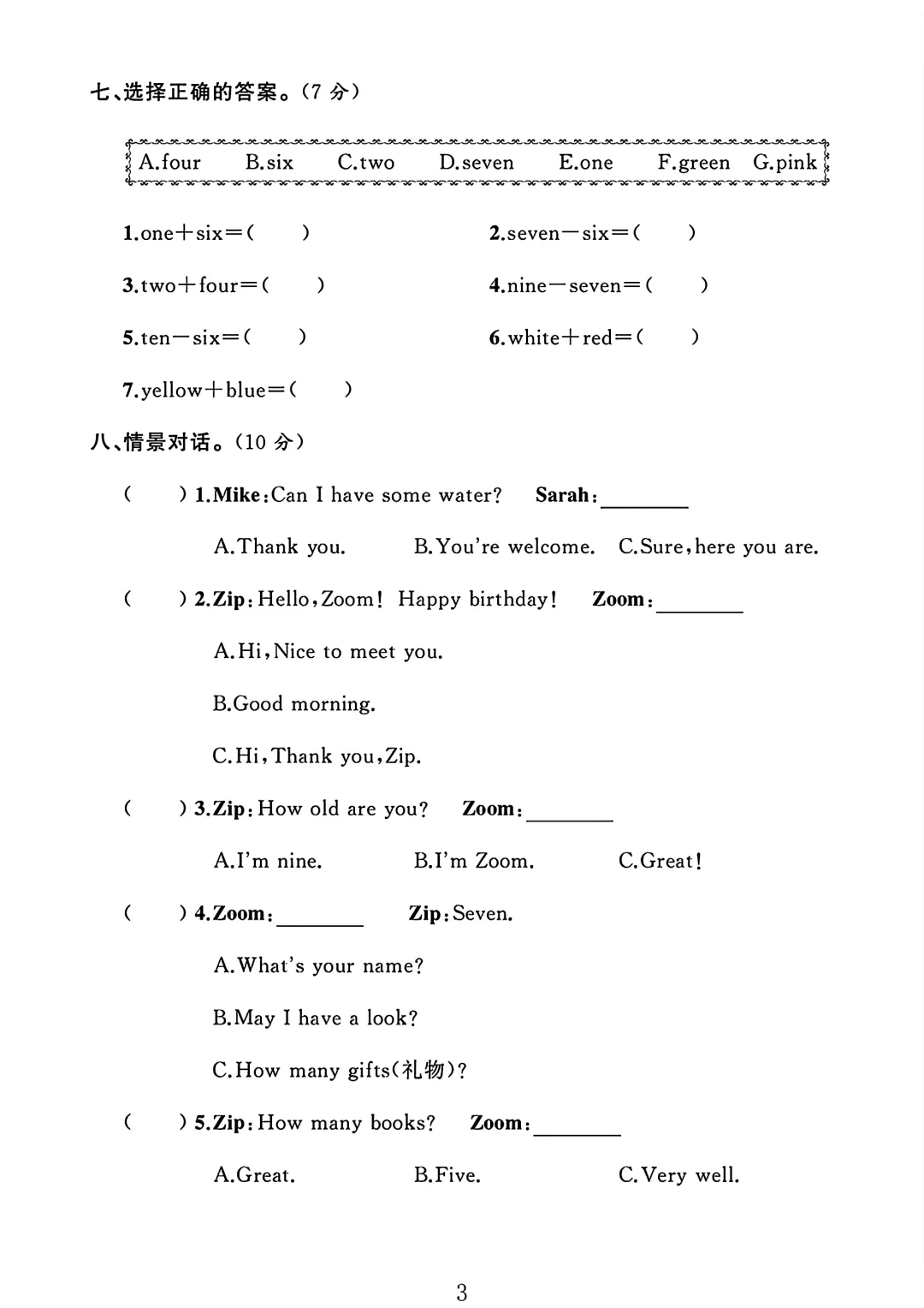 人教版 三年级上册英语 期末试卷 期末考试 期末 试卷 电子版可打印