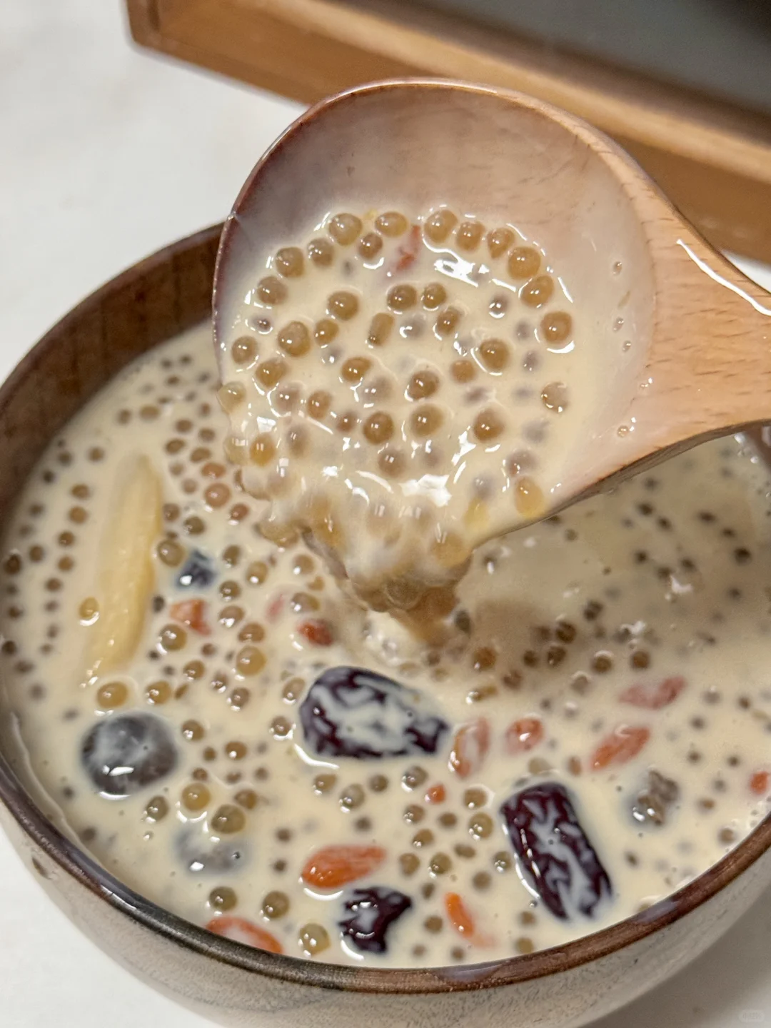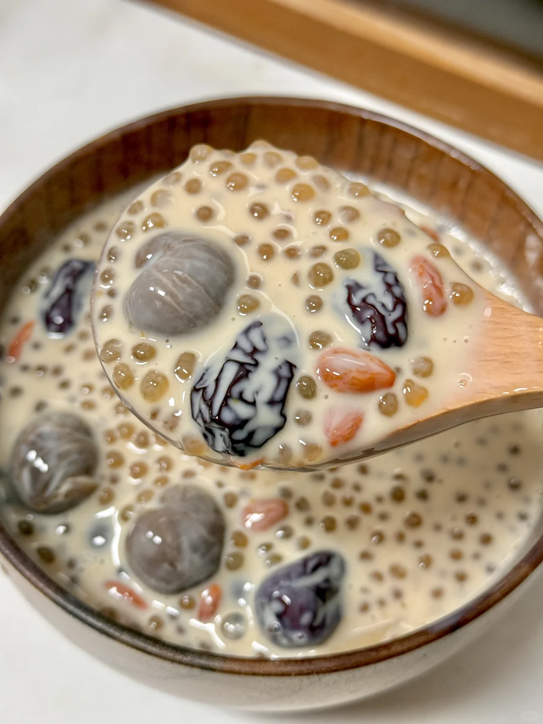 红枣桂圆西米露!! 奶呼呼的好香甜!!很适合女孩子喝! 秋冬暖呼呼的~简单又好喝