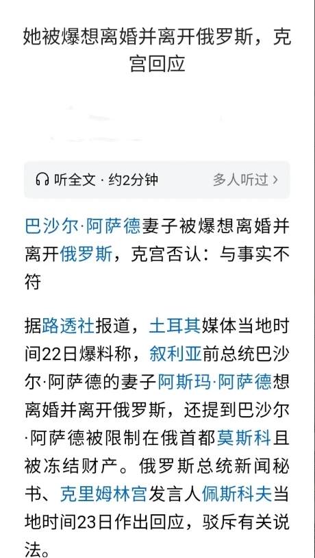 4、最后,关于巴沙尔妻子阿斯玛阿萨德想离婚的消息,完全就是土耳其媒体的无中生有,编造出来的。克里姆林宫已经帮巴沙尔两夫妻给辟谣了,驳斥了土耳其媒体有关说法。所以巴沙尔和阿斯玛两人不可能离婚他们的感情好着呢。#阿斯玛·阿萨德