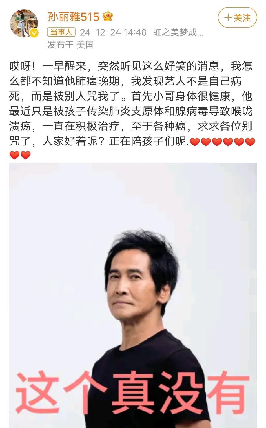 这才是今天娱乐圈最离谱的瓜! 12月24日,歌手齐秦被网友爆料已患癌,而且还是癌症晚期,很多齐秦的粉丝看到这条消息纷纷被吓到了,要知道癌症晚期很难被治好的。 就在粉丝的担心中齐秦老婆带来了一个好消息,齐秦老婆在社交平台发文否认了齐秦患癌,称齐秦只是普通感冒,而且现在已经好了,不知道怎么就被人传成患癌了,让有些人不要在“咒”齐秦了。 一些网友看后纷纷留言评论道: 肺癌和普通感冒可是完全两个概念啊! 人家18号还在宜宾唱了两首歌,他说他感冒了嗓子不好。 吓到了,还好是谣言。 齐秦前不久还开了一场演唱会,当时状态虽然称不上完美,但也没有被传的得了肺癌晚期的那种状态,不得不说这个谣言来的有点空穴来风,一点实证都没有就敢说人家已经肺癌晚期了。