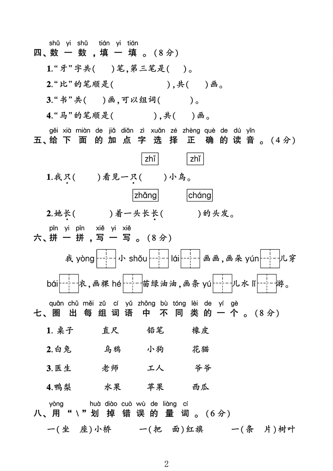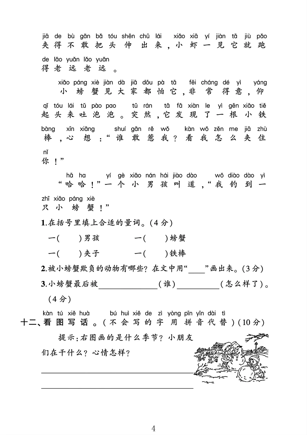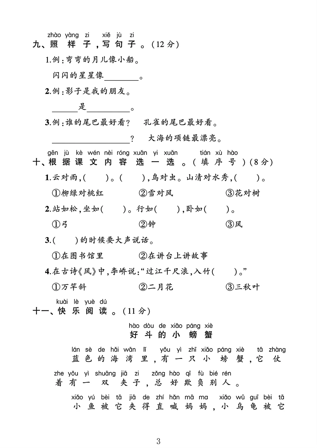 人教版 一年级上册语文 期末试卷 期末考试 电子版可打印