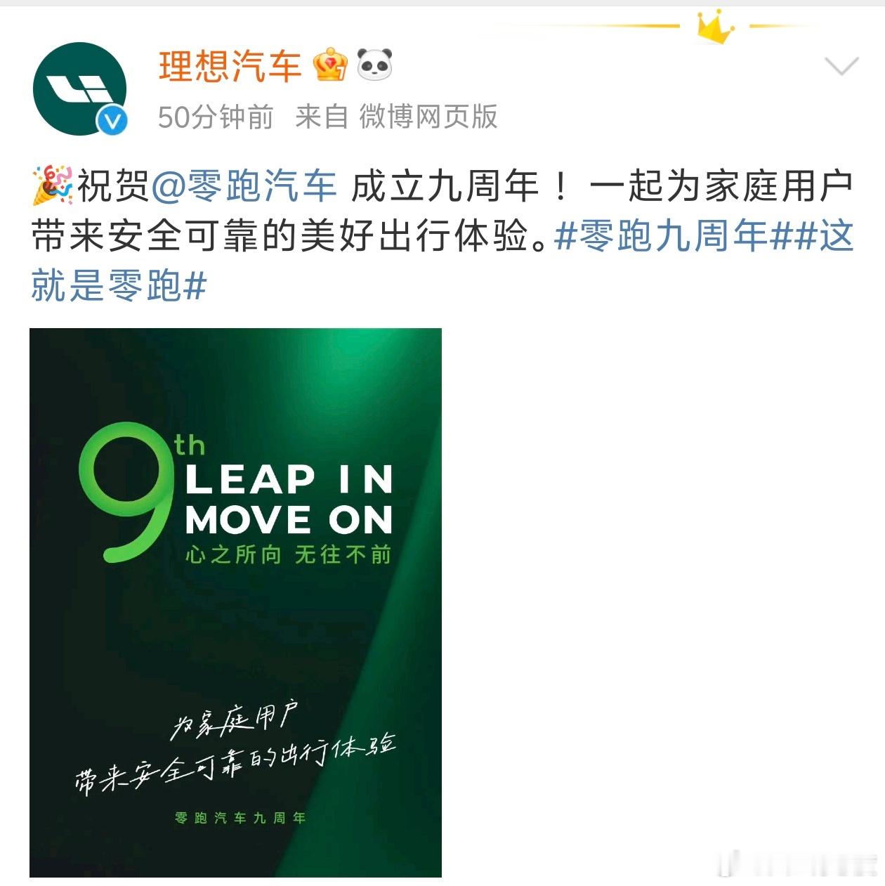 理想汽车官微祝贺成立九周年。一起为家庭用户带来安全可靠的美好出行体验。这很和谐。