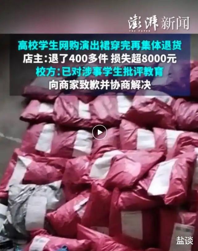 当然,学校里教了礼义廉耻,学校自己并不一定是这么干的。沈阳某学校,就好意思把60多件穿过的演出服以“质量问题”为由把衣服退给商家。导致商家商品链接被封3个月,损失8000多元。