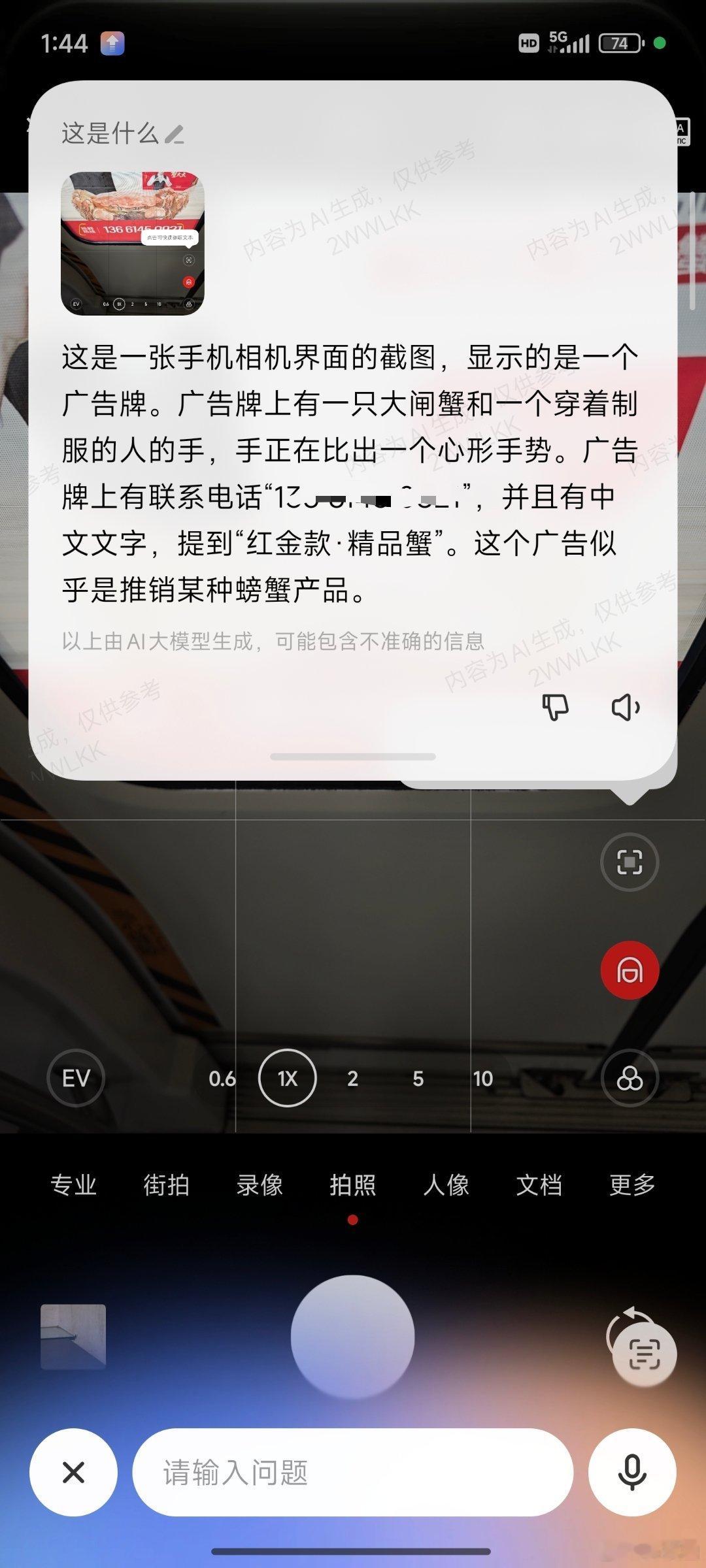 超级小爱首先识别了这是相机界面,然后识别相机内的相关信息,大闸蟹,以及穿制服比心的人。以及电话信息,判定为大闸蟹广告。
