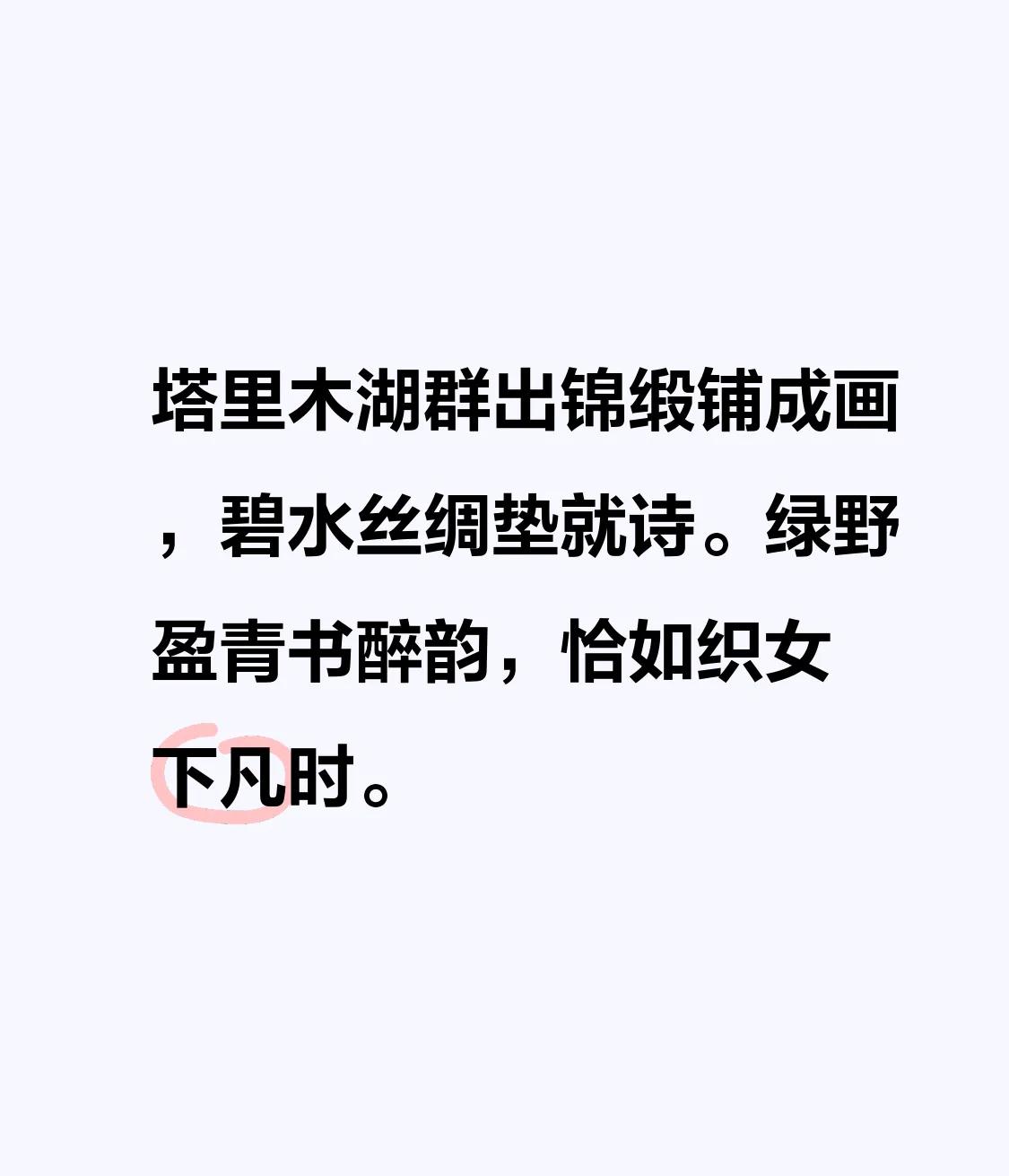 塔里木湖 群出锦缎铺成画, 碧水丝绸垫就诗。 绿野盈青书醉韵, 恰如织女下凡时。