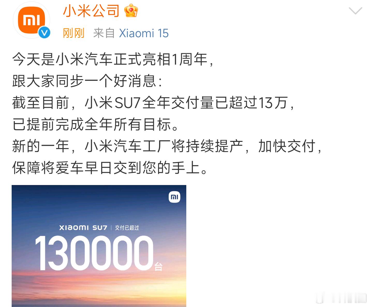 小米SU7一年交付13万台,也就是超过了之前保10,争12万台交付的目标。