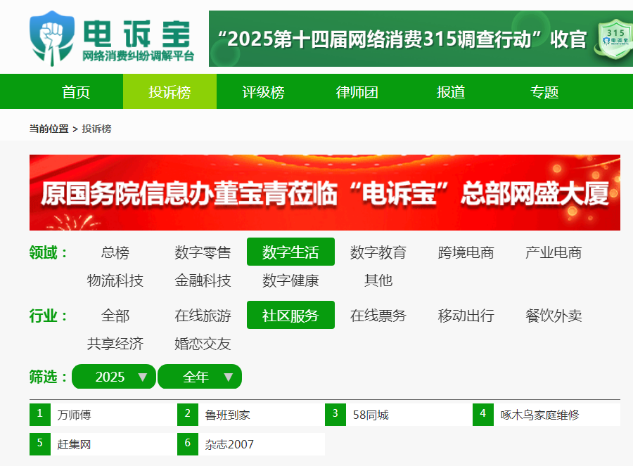 据国内网络消费专业消费调解平台“电诉宝”发布的《2025年社区服务投诉榜》显示,入选投诉榜(依据投诉量排行)的依次为:万师傅、鲁班到家、58同城、啄木鸟家庭维修、赶集网等。