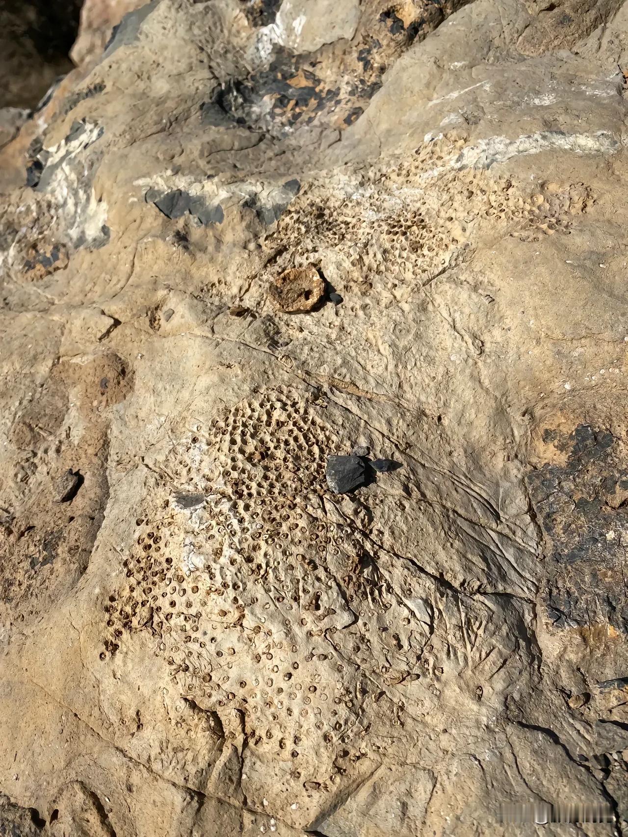 这边有煤的地方一般不单单有植物化石,因为当时是海陆交互的环境,有些地方也可以看到很多海洋生物的化石。图二:珊瑚化石;图三:腕足化石;图四:遗迹化石
