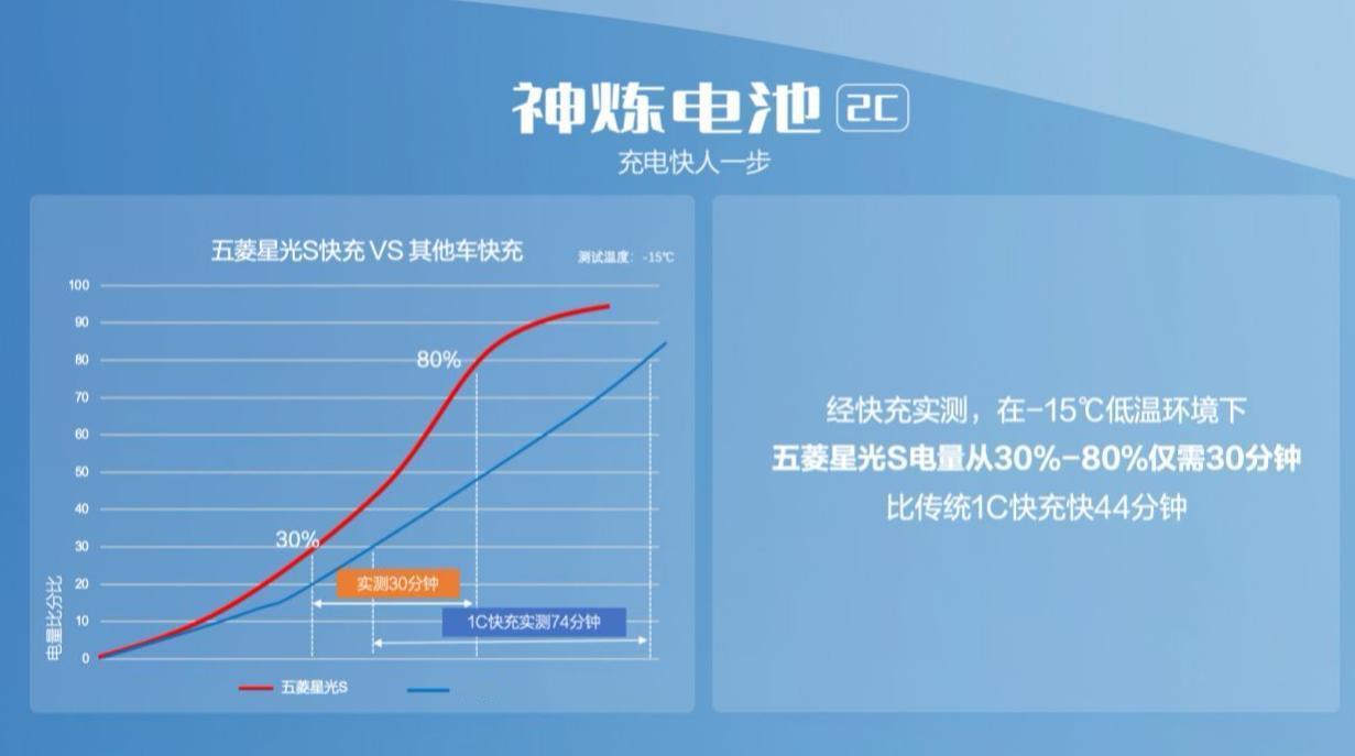 不测不知道,一测吓一跳,五菱星光S实测续航竟然还比理论续航还多出近40km? 12月初,在国内某知名大型汽车媒体的新能源超级测试冬季首测中,五菱星光S以144%纯电续航达成率斩获低温区SUV冠军,并荣获汽车之家“反向虚标奖”权威认证,这到底是怎么回事? 原来是,星光S的混动版,在5℃~15℃的低温环境下,测试出的真实续航达到129.6km,比WLTC续航多出了近40km,一下子成为很多网友热议的话题,原来五菱星光S是如此低调做事。 星光S扎实的续航表现,也让它快速获得高销量,上市不足4个月,累计销量就超过了3万台,成为五菱在10万级家用SUV市场中的一匹黑马。 另外,星光S的冬天充电速度也很快,车辆在-15℃低温下,电量从30%充至80%,仅需30分钟,比市面上很多新能源车的充电速度都快很多。如果在冬天出门充电时,坐在车上玩一会手机,或者去超市商场逛街购物的时间,电量就能充不少了,实现了城市通勤纯电出行,节省了用车成本。