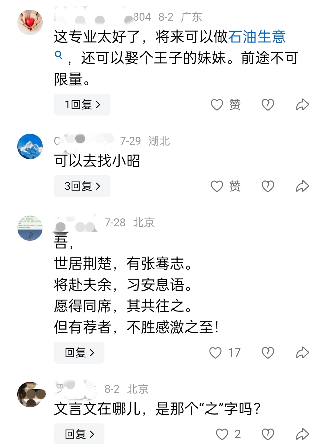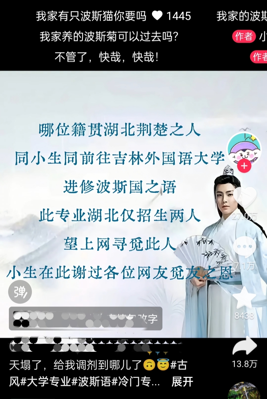 社交平台上,一名湖北考生表示,自己被吉林外国语大学调剂到了波斯语专业,于是在网络上用文言文发帖寻求同窗。