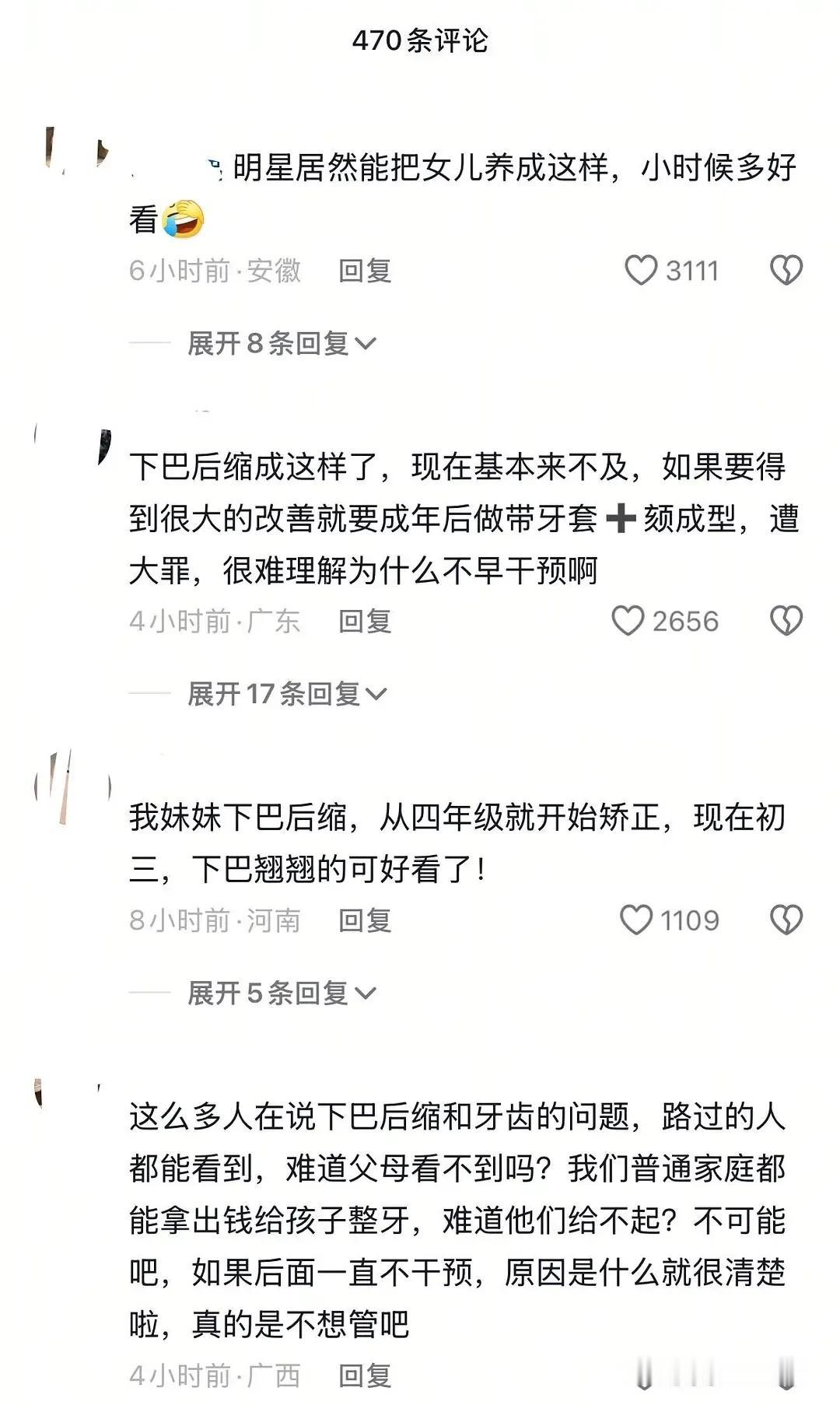 田亮两口子养女儿真的不是很上心啊 森碟现在下巴后缩很严重,而且已经错过最佳矫正期。现在想矫正应该只能做下颌关节的手术,后遗症很大,好多人做完手术经常掉下巴等等。可森碟这种情况通过整牙整回来的很难。 之前森碟骨裂,没看医生,两口子说“你至于吗”然后自己愈合。 不得不说森碟真的是从小到大都这么乖这么听话,不喜欢给别人添麻烦。另外做父母的怎么会不爱自己的女儿,希望只是角度问题吧。 那么漂亮的孩子,可一定不要下巴后缩呀!