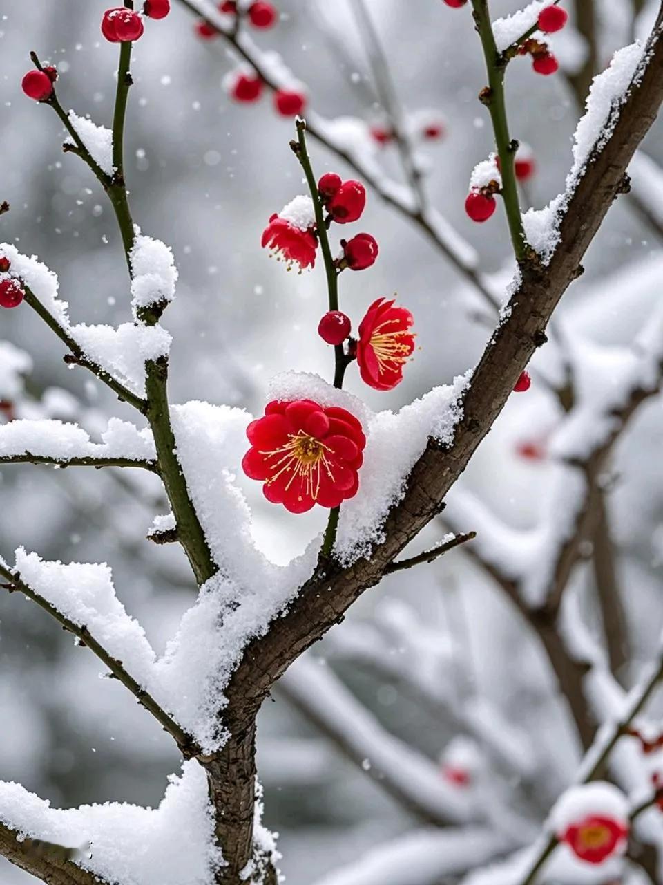 寒天雪舞漫天涯 玉树琼枝覆万家 独有红梅凌冽绽 雪飘漫舞吻梅花