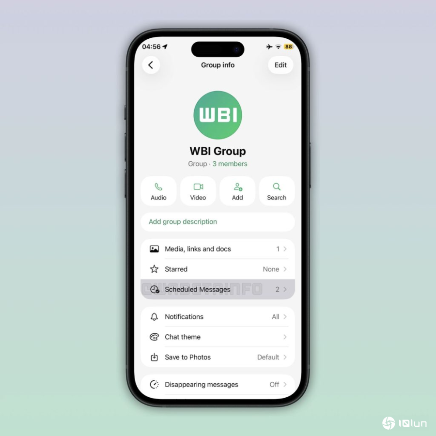 据报道,该功能“目前正在开发中,尚未开放beta测试”。不过,他们分享了一张群组信息界面的截图,截图中在“媒体、链接和文档”和“星标”选项下方出现了“定时消息”菜单项。