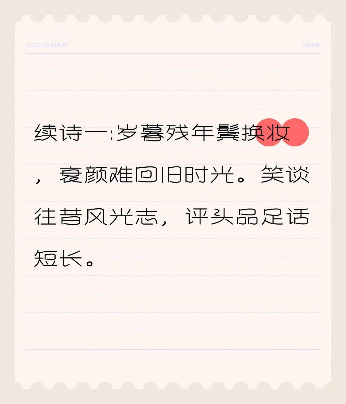 续诗一: 岁暮残年鬓换妆, 衰颜难回旧时光。 笑谈往昔风光志, 评头品足话短长。