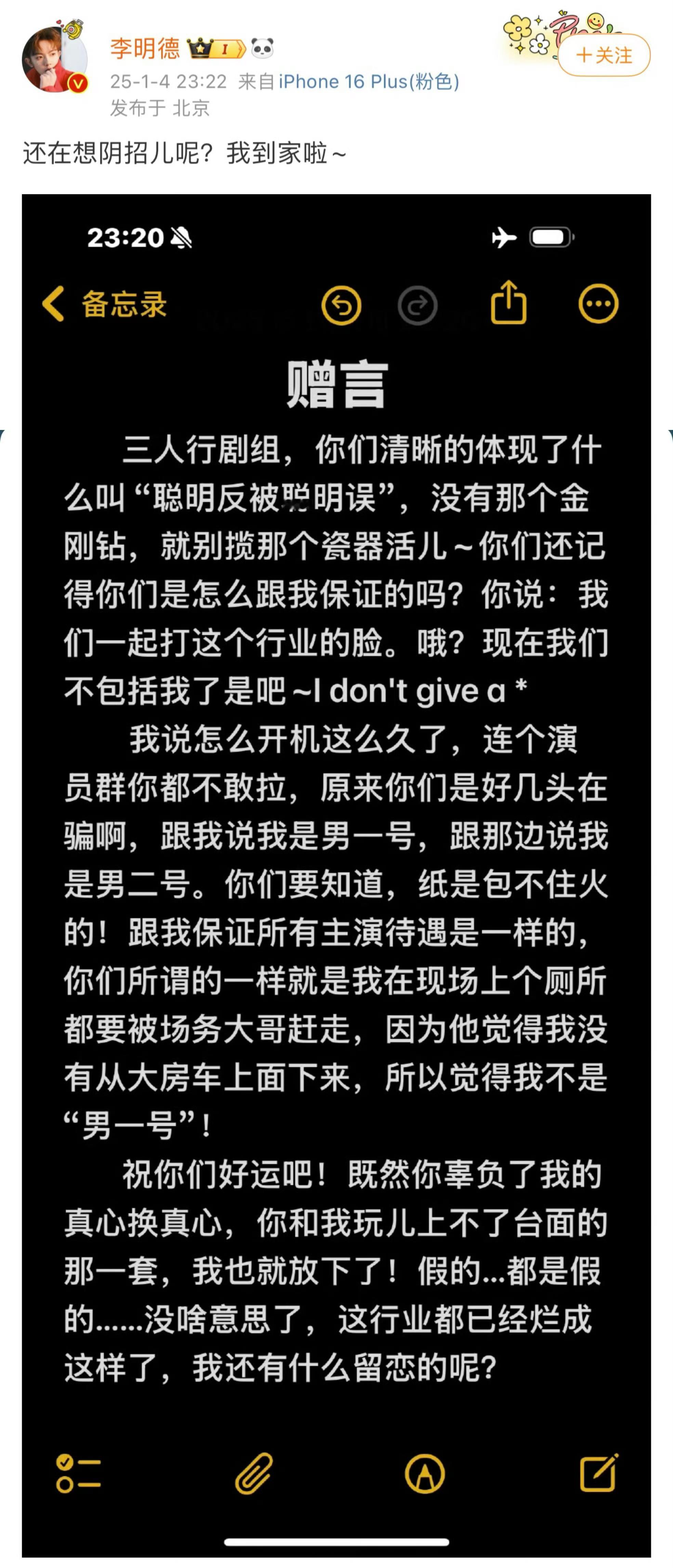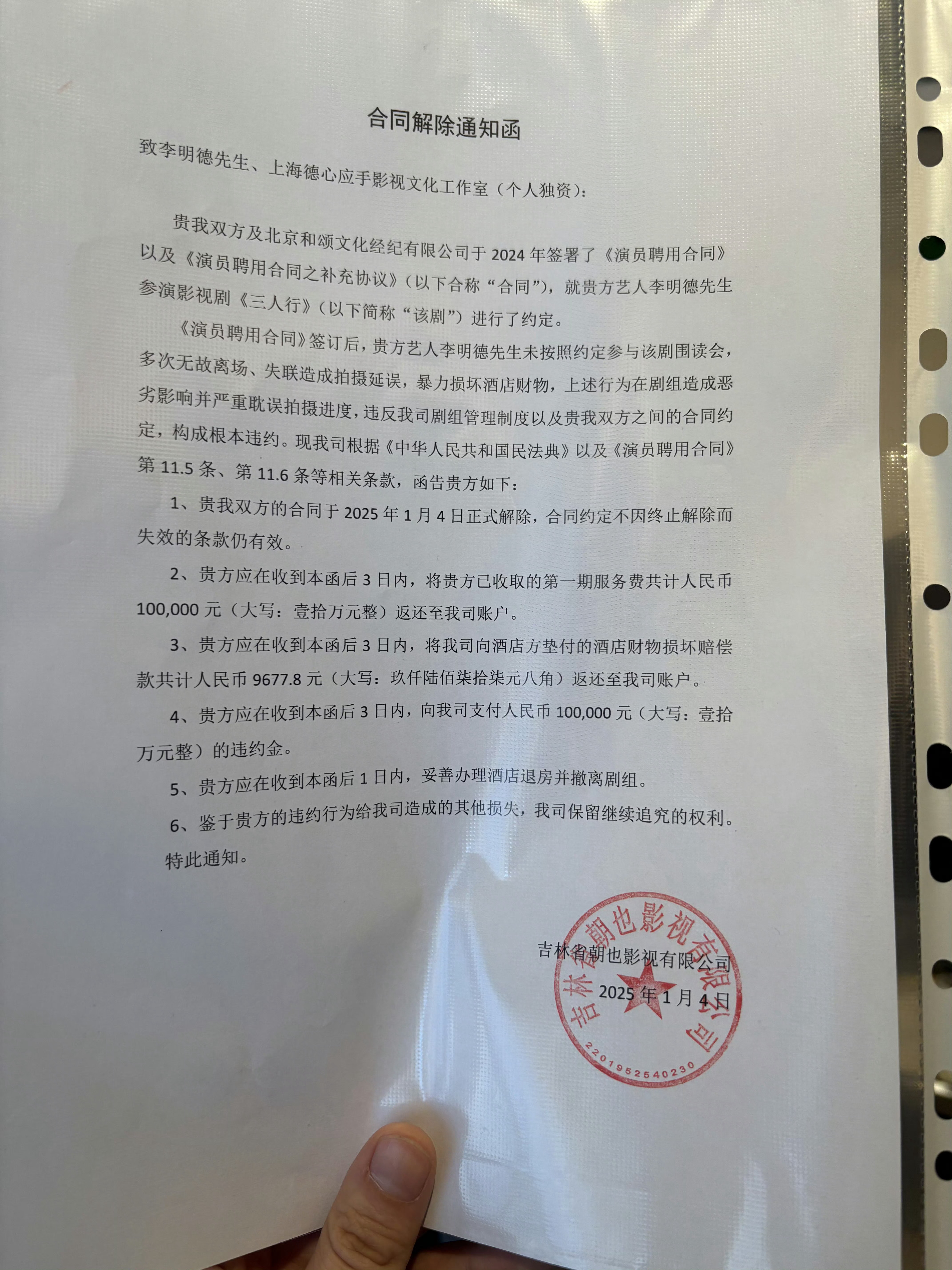 三人行剧组开机前就想换了李明德 有知情人士爆料,说马天宇剧组围读没来是正常请假,剧组开机前就想换了李明德,番位没有两头骗,解释会剧透最大的梗。李明德晒了剧组合同解除通知函,要求他退还第一期服务费10万,赔偿酒店财物损坏9677.8元、违约金10万元……