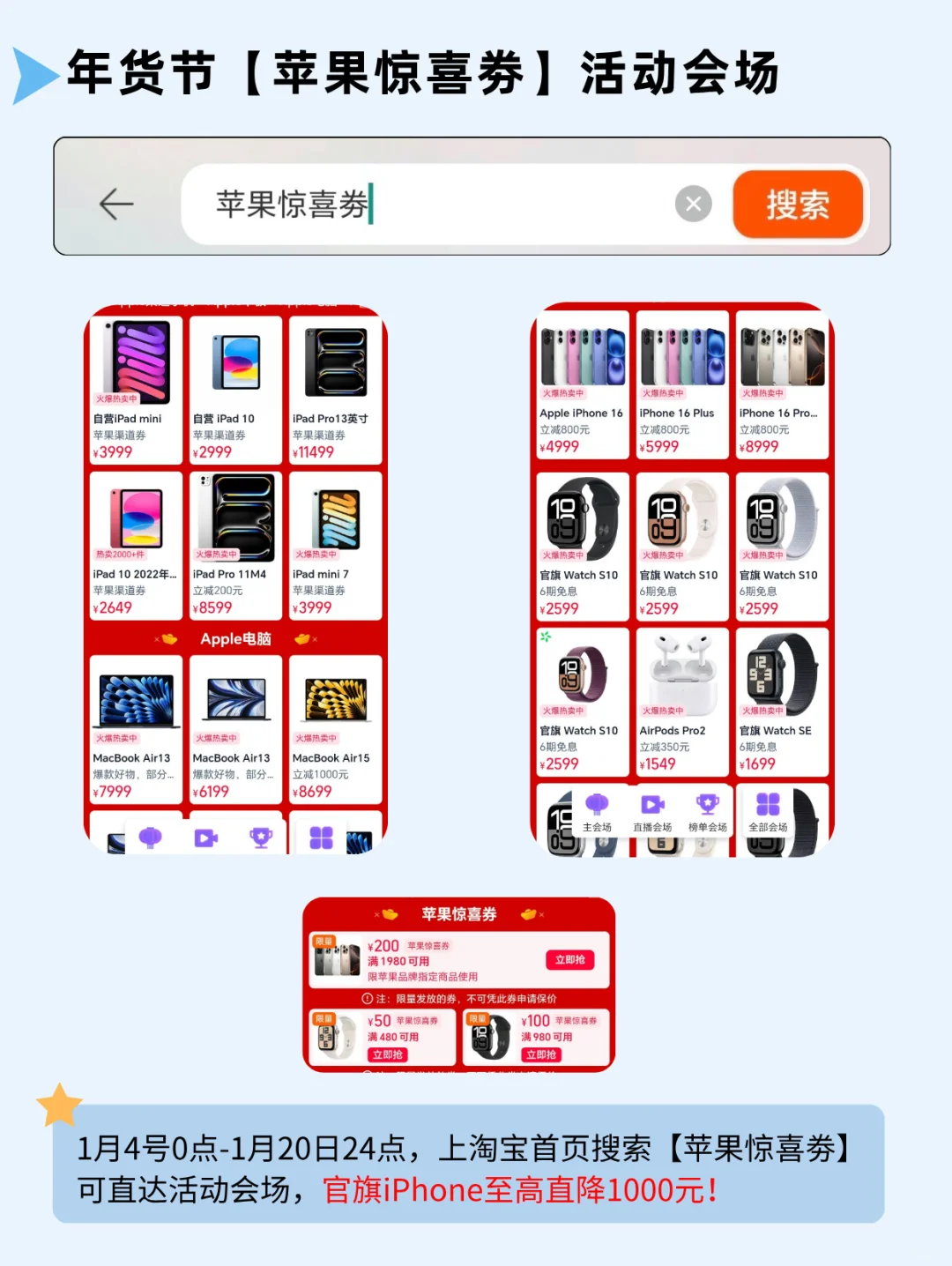 大家可以在淘宝🔍【苹果惊喜券】就能直达活动会场,就可以直接领取了[派对R][派对R]!6号晚8点天猫年货节开卖就能马上用啦