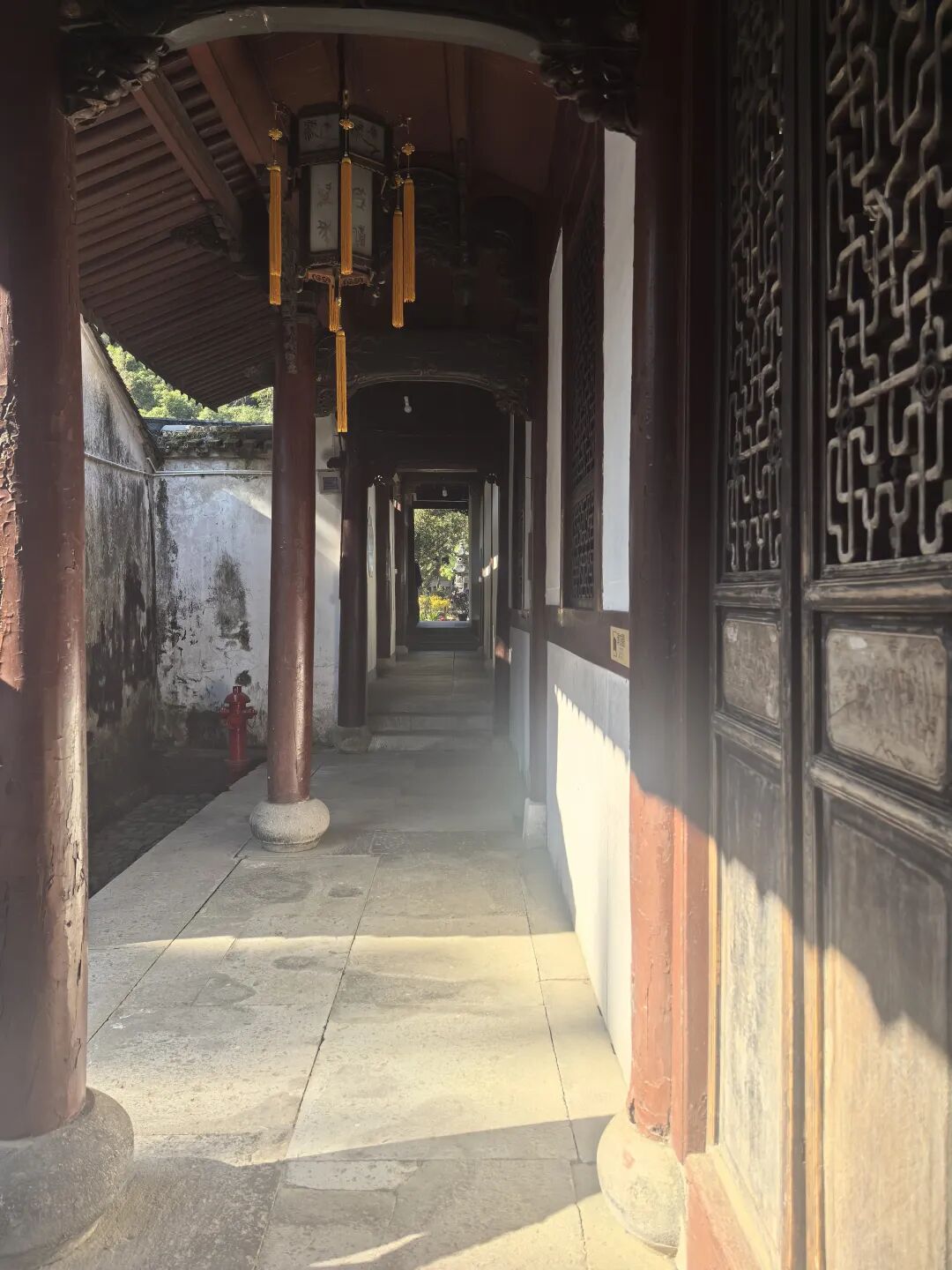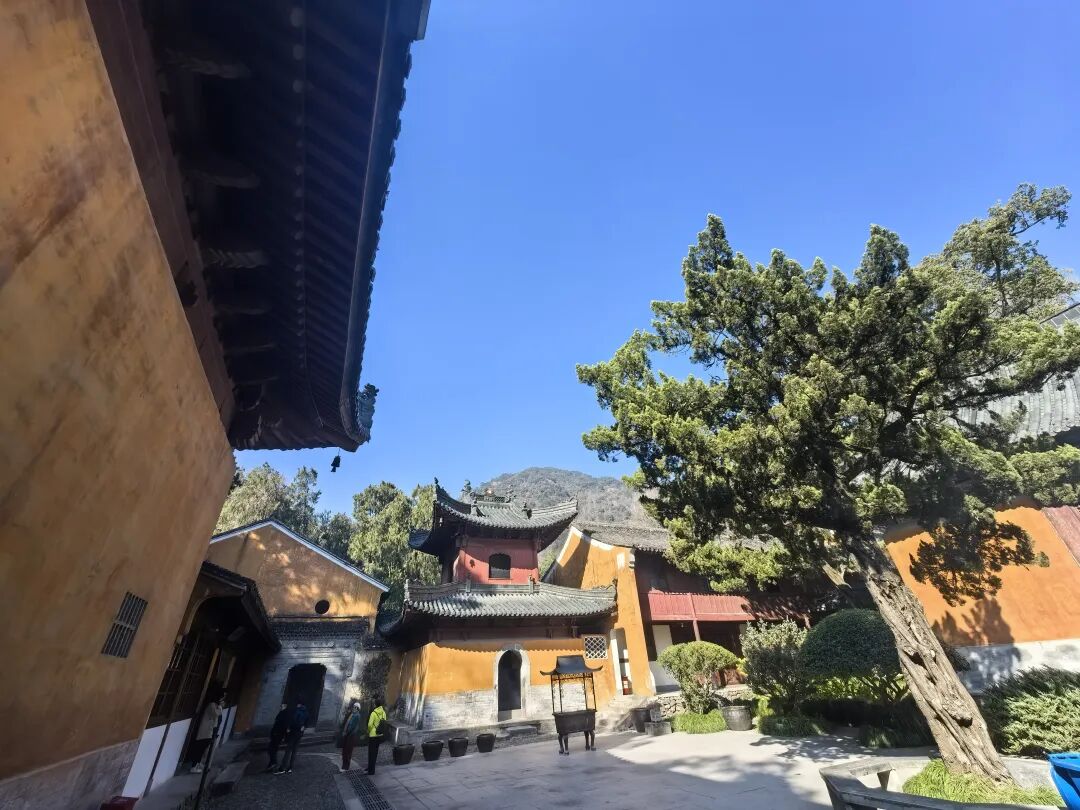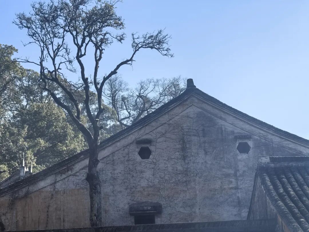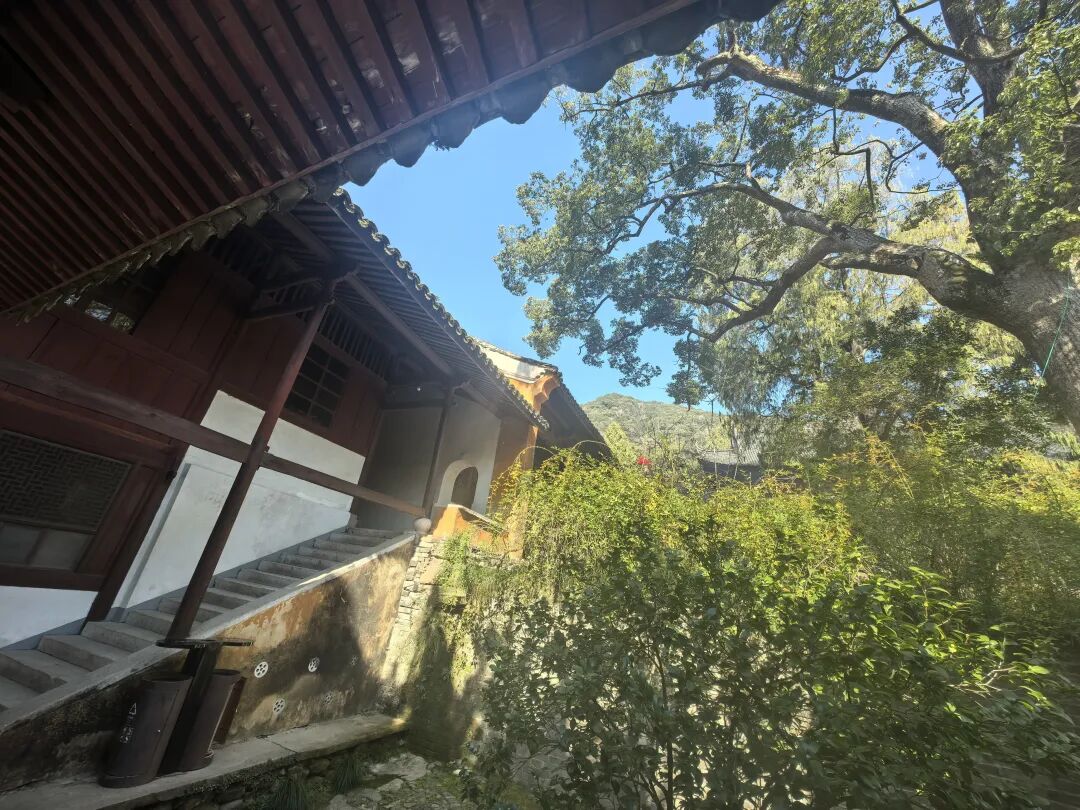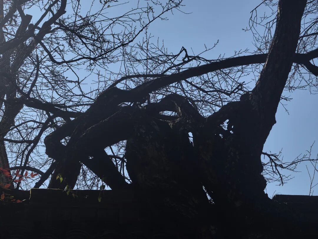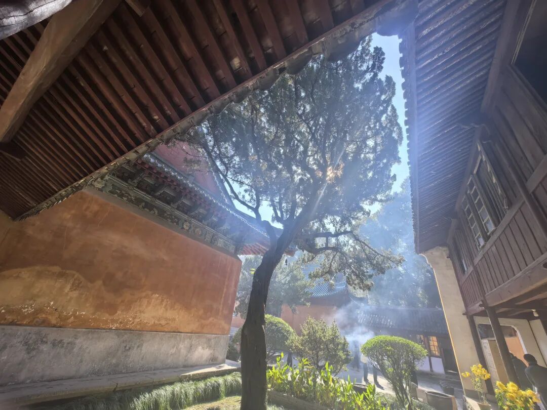 往山门走的路上,心里又惦起那株著名的隋梅。这个时节,它没有花,也没有叶,所有嶙峋的枝干都赤裸裸地伸向青空,每一道转折都苍劲如铁,沉默着,却仿佛能听见内部磅礴的、等待春天的力。方才方丈室里温煦的谈笑,那橘子的甜,那茶的暖,似乎还在耳畔鼻尖萦绕;此刻,面对这穿越一千四百年时光的、一言不发的生命,两种“存在”忽然叠在了一处。一份无需言语的印证,在这午前澄明的空气里,静静地完成了。
