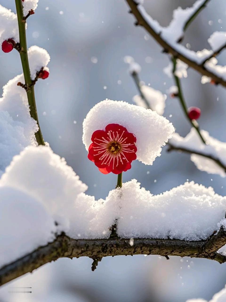 寒天雪与梅相伴 同守岁华心未变 风里香飘意韵悠 雪吻红梅风景妍