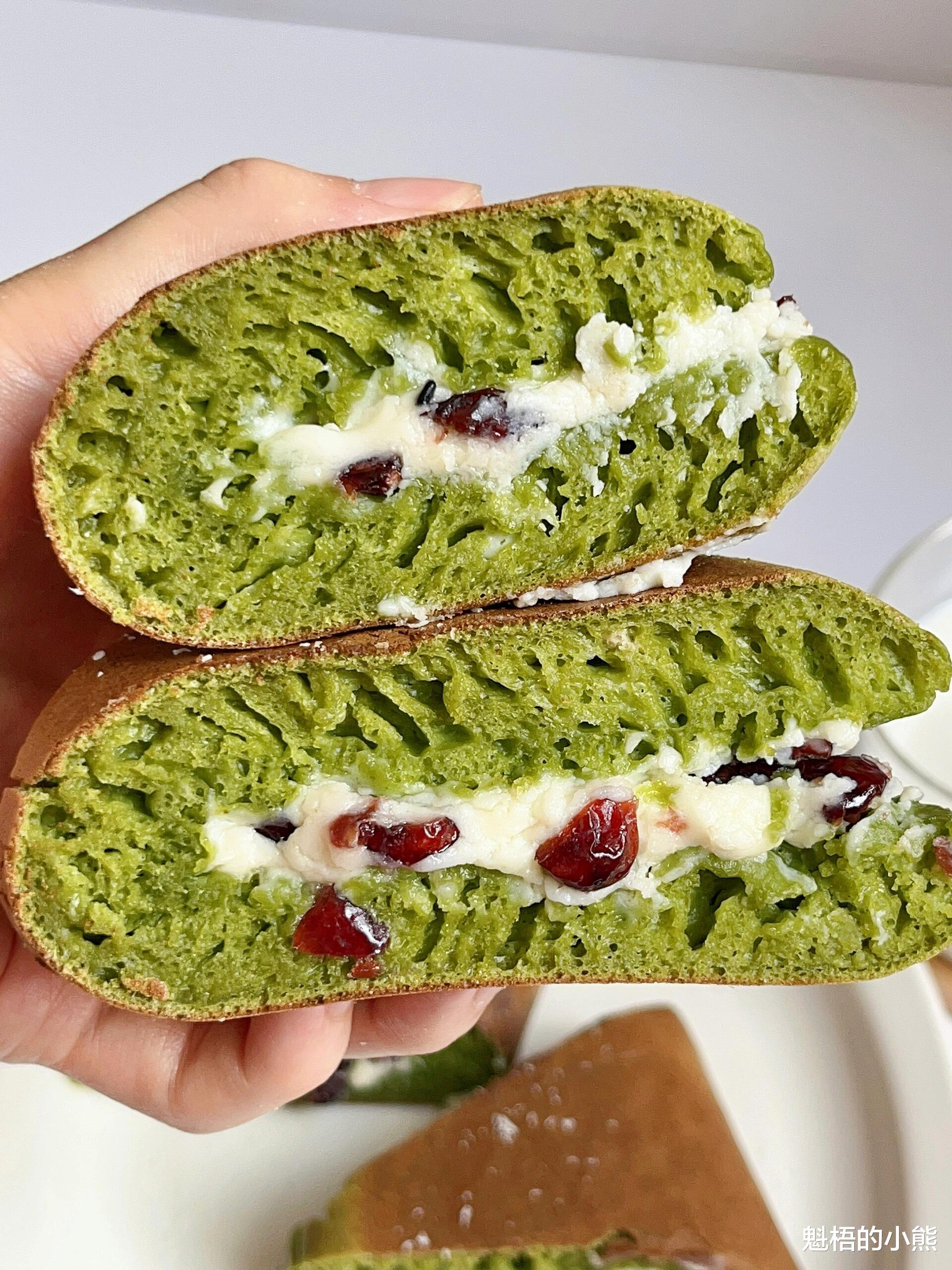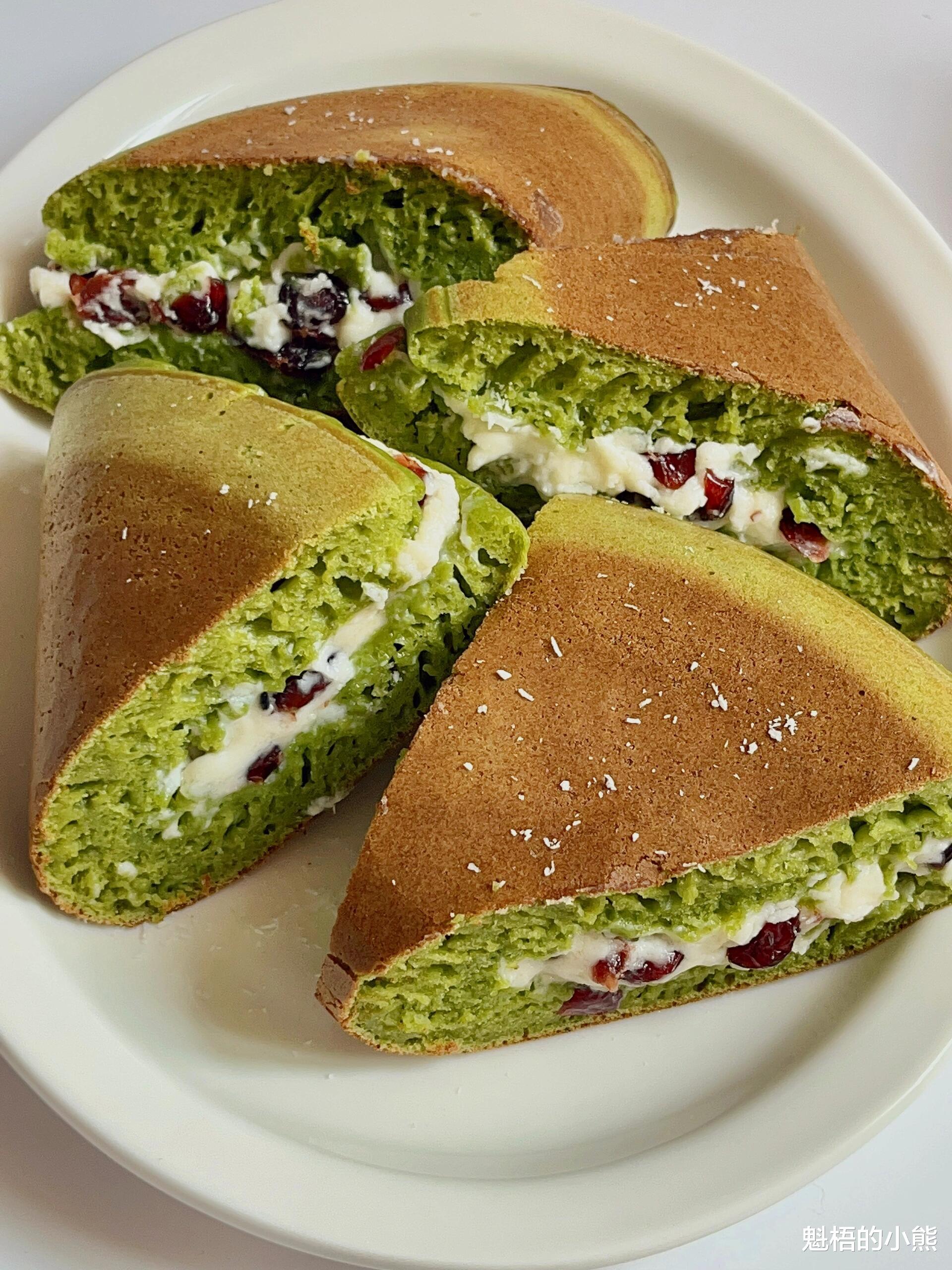夏天到了,早餐想吃点清爽的,又不想大清早就在厨房里忙得满头大汗。这款抹茶松饼就是为这样的早晨量身定做的。不需要打发鸡蛋,不需要洗一堆碗,所有面糊材料搅一搅,静置发酵,然后倒进平底锅,小火慢煎。看着面糊表面冒出细密的小气泡、边缘渐渐凝固,翻个面,另一面就能烙出漂亮的焦糖色。抹上奶酪蔓越莓馅,对折起来,一块厚厚的、松软的松饼就完成了。抹茶的微苦、奶酪的咸香、蔓越莓的酸甜,还有松饼本身的蛋奶香,一口下去,像在吃蛋糕版的铜锣烧。最妙的是,面糊可以头天晚上准备好,放冰箱冷藏发酵,第二天早上直接从冰箱拿出来就能用,十分钟就能吃上热乎的早餐。抹茶控一定要试试这个配方。