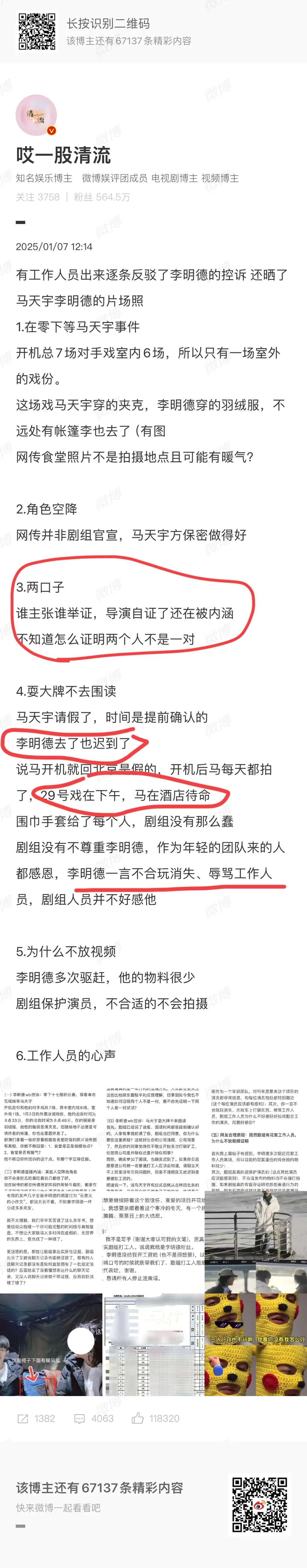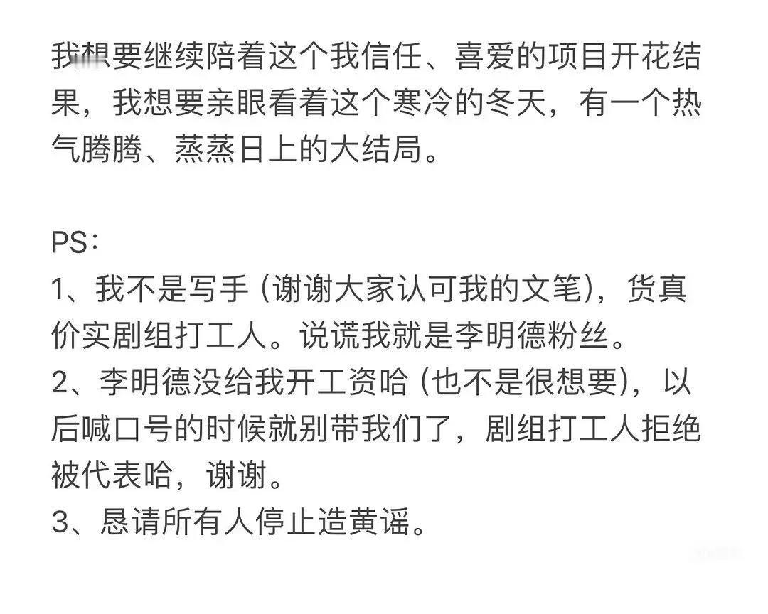 29号开机,28号就写好离别信的李明德,是如何利用观众,颠倒黑白?原来2022年的凡星公司已经告诉我们答案。 甚至《鸣龙》剧组的演员和群演也纷纷表示李明德不止一次欺负剧组打工人。 不过这年头,简单粗暴的情绪输出>长篇大论。 之前这个工作人员发文和导演声明,基本没人看,其实狗仔阳阳发了李明德的C照和前女友的就诊记录,说希望他告,但李明德很聪明的从不回应这些。 水能载舟亦能覆舟,利用大众同理心的人也必被之反噬。 如今他靠直播赚得盆满钵满,马天宇呢?已经成为了破鼓万人锤的那个骨。 可能已经没什么人再去愿意看剧组人员说的话了,只愿意相信连证明都拿不出来的群演
